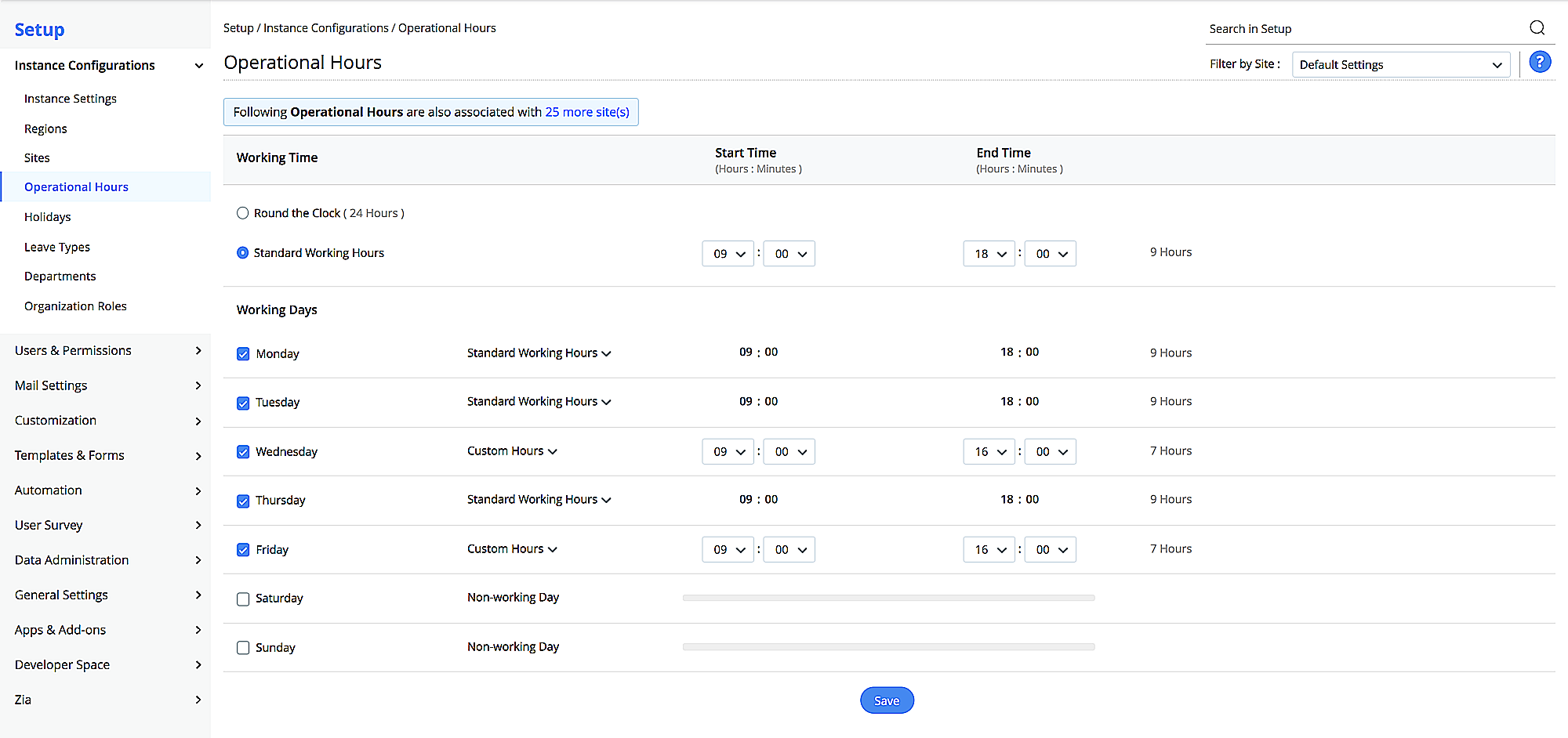 You can now configure custom operational hours specific to selected days in week from Setup > Instance Settings > Operational Hours. The custom operational hours can also be configured across multiple sites within a service desk instance