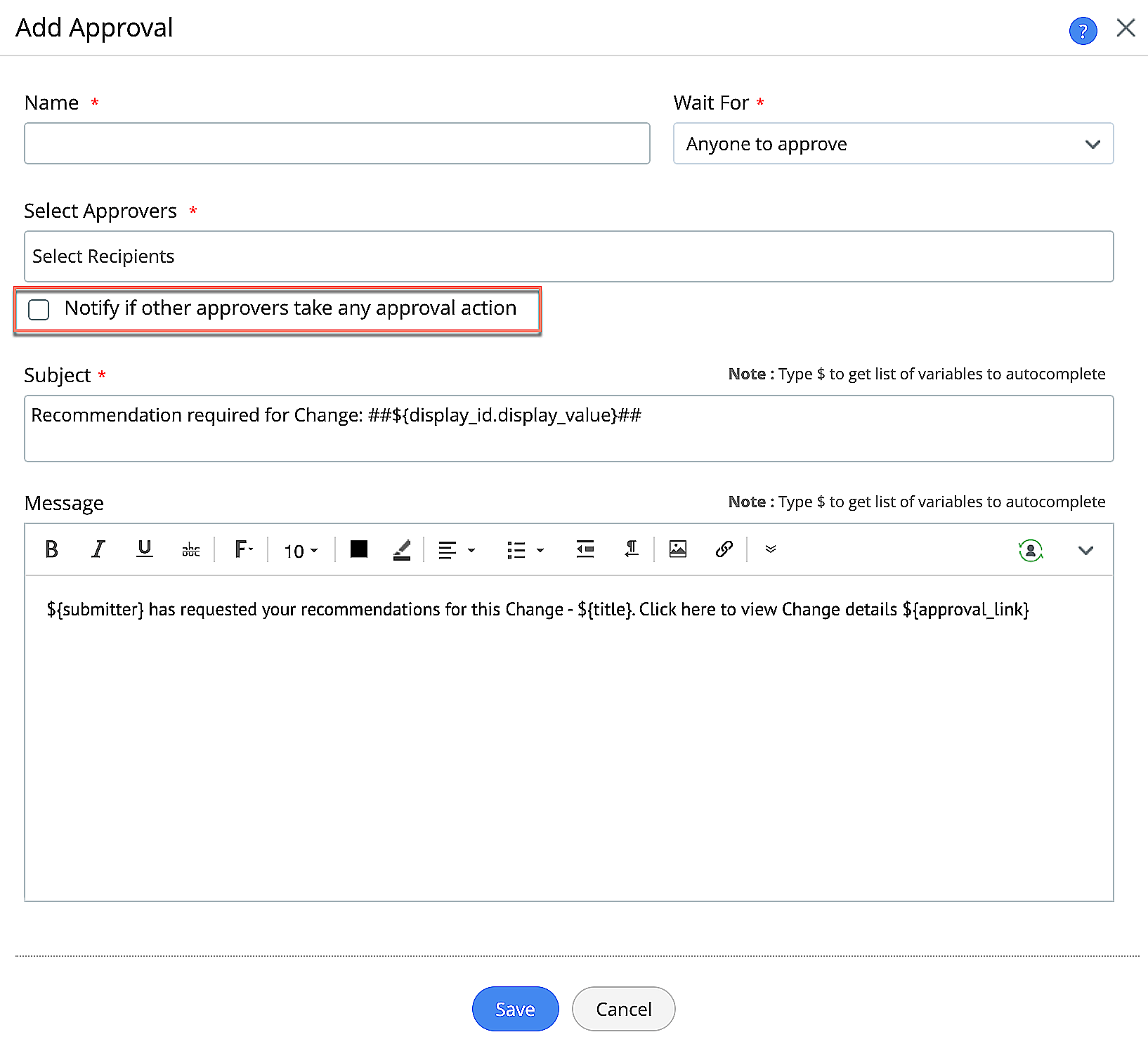 Approval action taken by a change approver can now be notified to other change approvers who are yet to take an approval action. To do this, select the Notify if other approvers take any approval action option when configuring an approval node in change workflows.