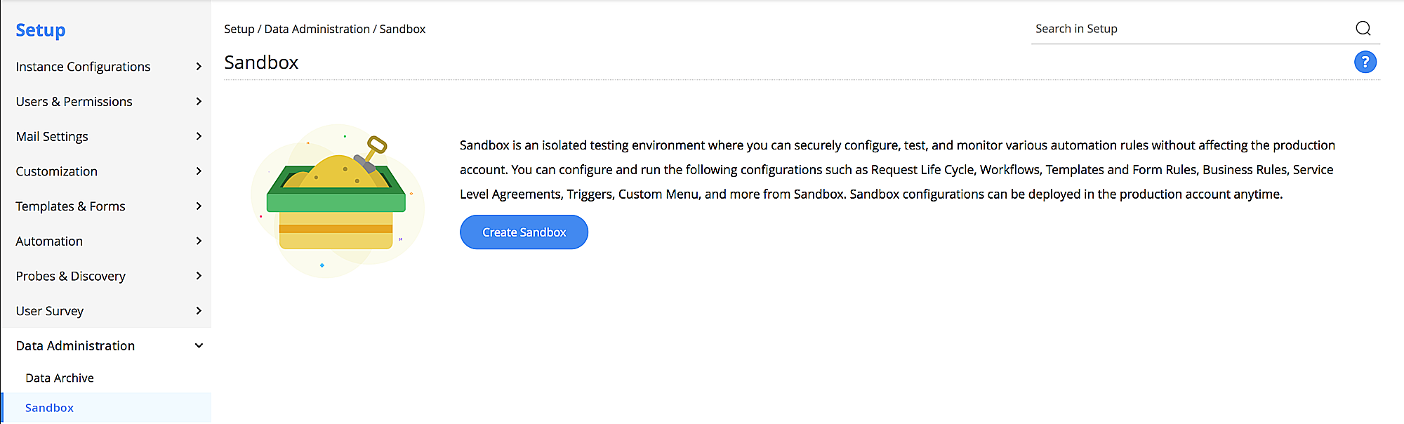 The Sandbox in ServiceDesk Plus Cloud is an isolated testing environment. You can securely experiment and test various admin configurations to understand their impact on your data, without actually interfering with the data in your production account. After reviewing the new or modified admin configurations, you can deploy the changes to your production account.