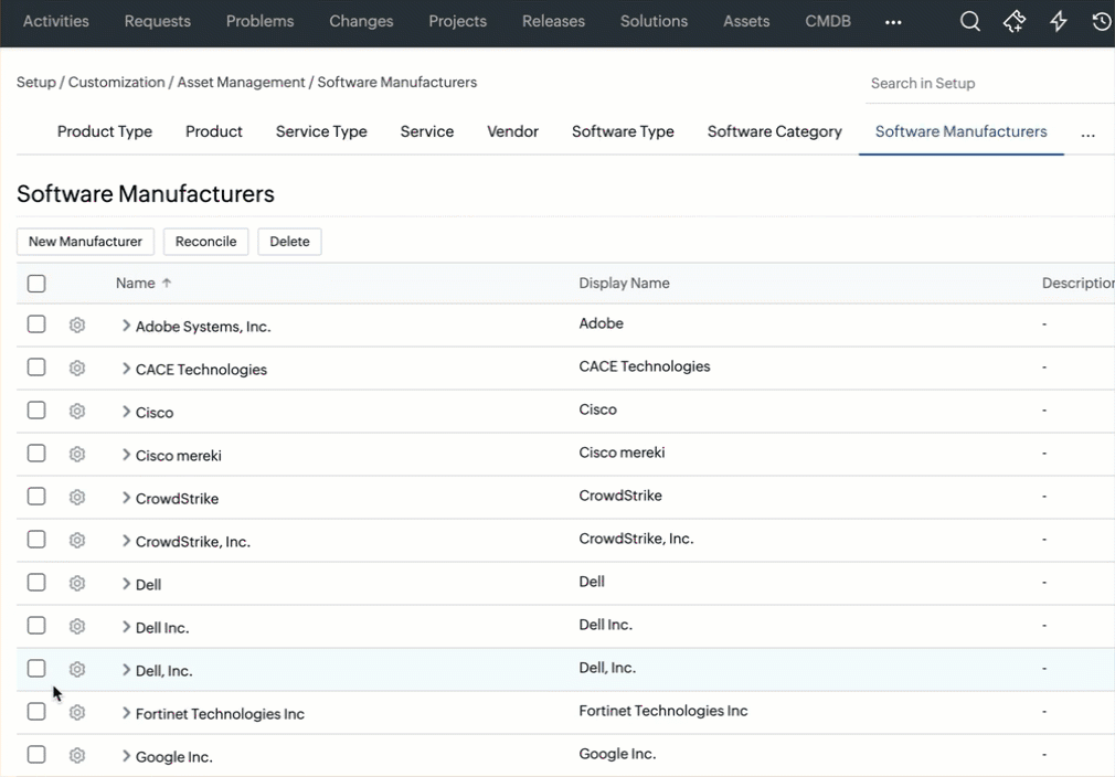 Technicians with SDAdmin or AssetConfig roles can now manage software manufacturers of all IT assets under Setup > Customization > Asset Management > Software Manufacturers.