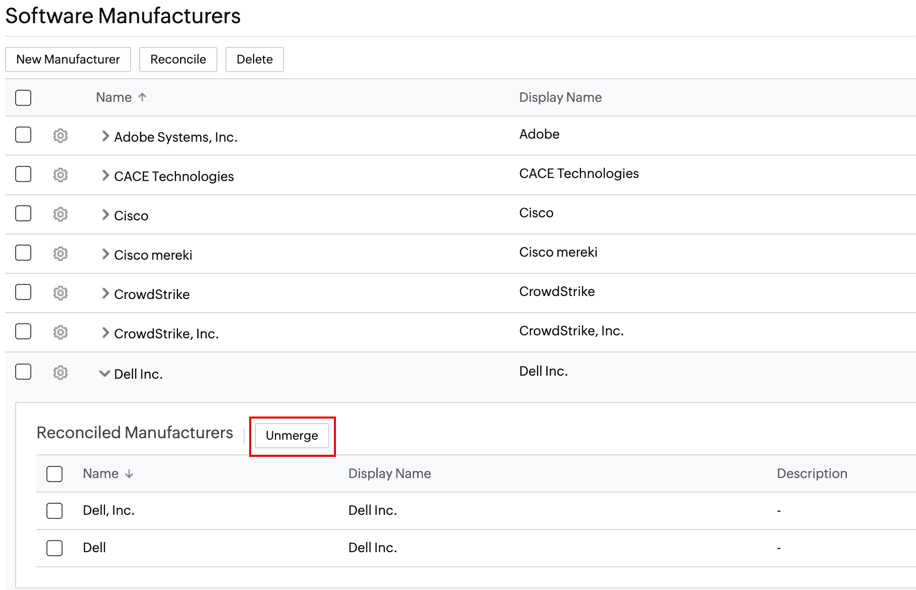 Unmerge all or specific child software manufacturers by clicking Unmerge under the parent manufacturer.
