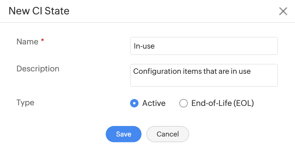 Track and manage the life cycle of configuration items (CIs) by using CI states. Create new CI states under Setup > Customization > CMDB > CI States.