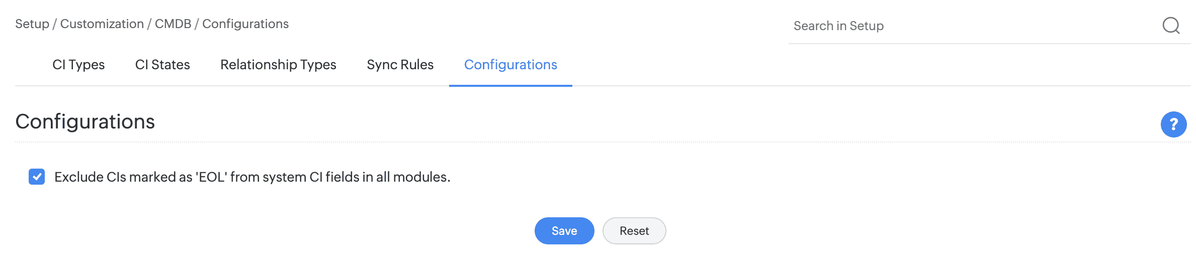 Use the settings under Setup > Customization > CMDB > Configurations to hide EOL marked CIs across all modules. EOL marked CIs will not be listed in the CIs field across all modules.