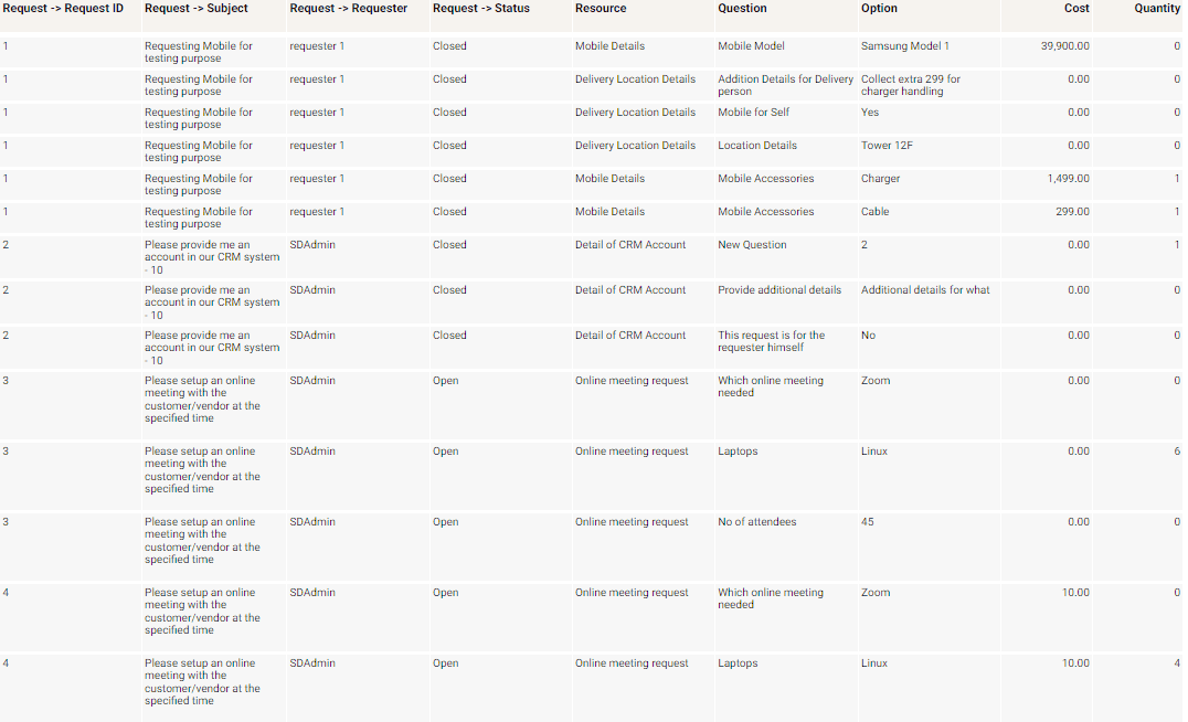 The available fields for report generation and advanced filtering are Request Fields, Resource Name, Resource Description, Question Name, Question Maximum quantity, Answer, Cost, and Quantity.