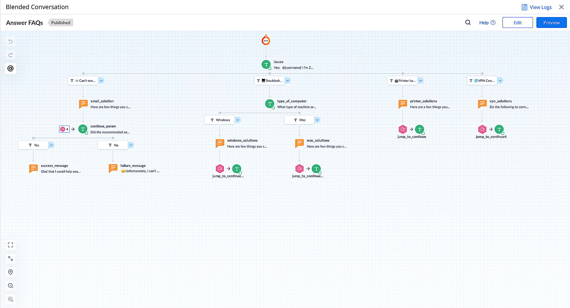 Build interactive user conversations using Zia Blended Conversations. Administrators can design responses to common user queries and automate frequent processes using a low-code flow builder. Blended Conversations are embedded into Zia Chatbot to enhance self-service capabilities.