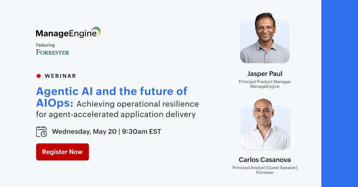 Join us for an exclusive webinar featuring Carlos Casanova, Principal Analyst at Forrester, and Jasper Paul, Principal Product Manager at ManageEngine, as they unpack how enterprises can evolve their AIOps and observability strategies to stay ahead.