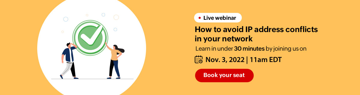Tired of troubleshooting end-user complaints about IP address conflicts? Often, you and your team are only alerted about this issue when an end user reports it or when it cascades into a major network issue. Here's how you can avoid this hassle: Join our 30-minute webinar on "How to avoid IP address conflicts in your network."