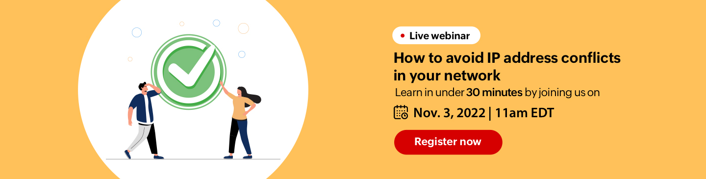 Tired of troubleshooting end-user complaints about IP address conflicts? Often, you and your team are only alerted about this issue when an end user reports it or when it cascades into a major network issue. Here's how you can avoid this hassle: Join our 30-minute webinar on "How to avoid IP address conflicts in your network."