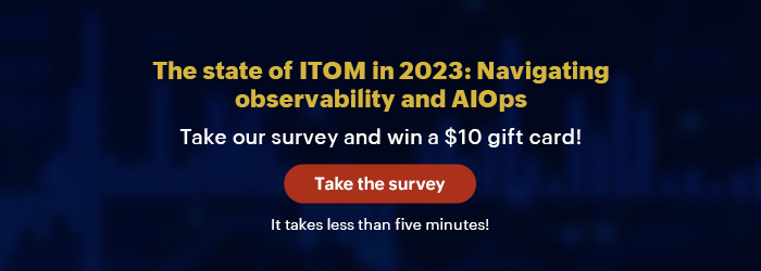 Now it's your turn to tell us firsthand about your experience with observability, AIOps, cloud migration, and more, and how you plan to tackle ITOM challenges in 2023. Take our short survey and let us know your predictions, observations, and insights. You could win a $10 gift card by participating!