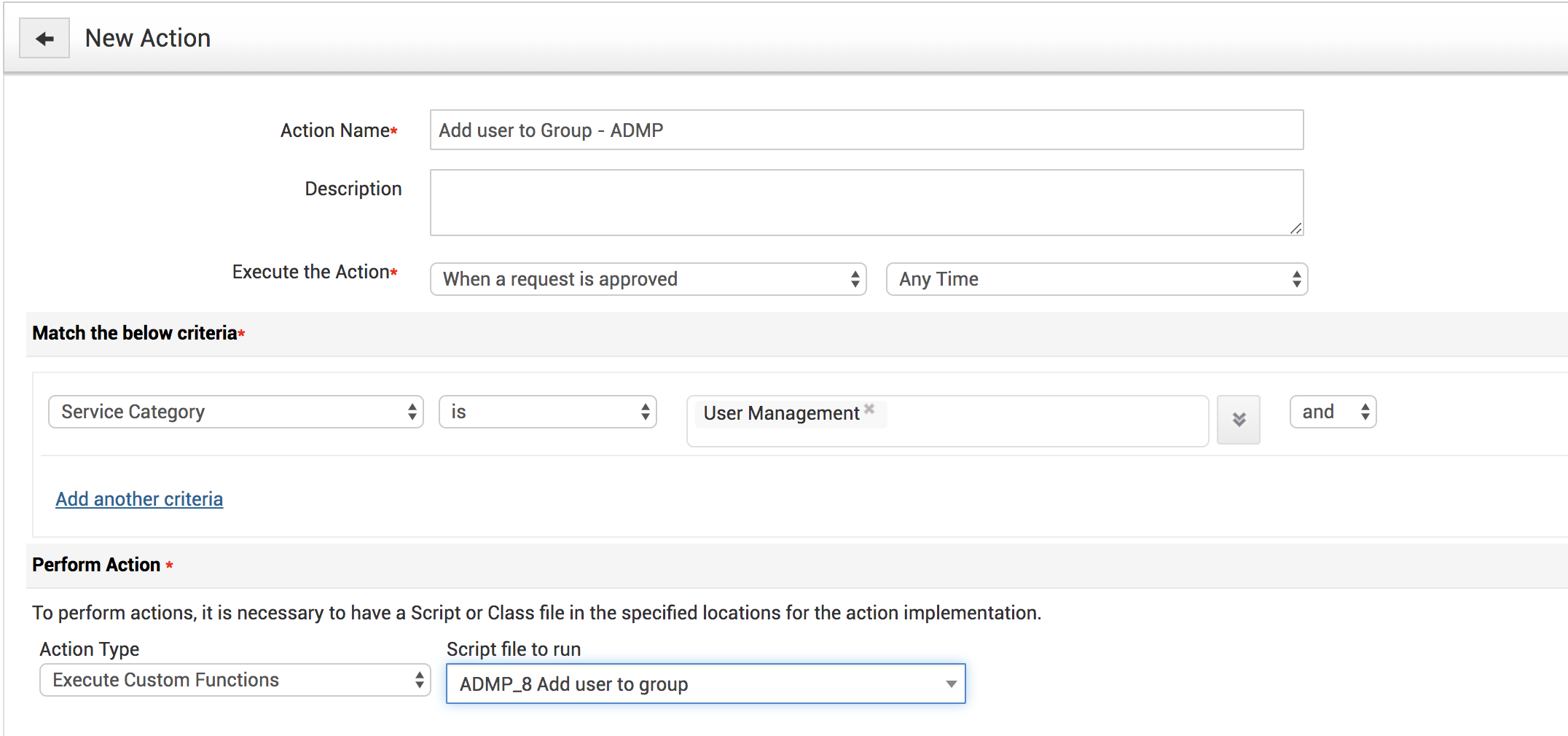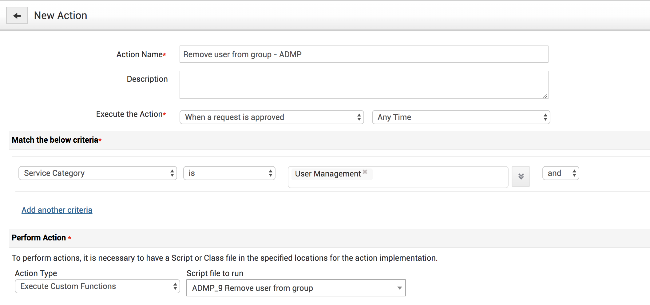7. With custom triggers we can configure criteria such as ‘when a request is created or approved’ to invoke the deluge script stored in the custom function and automatically to add/remove the user from a group in ADMP.