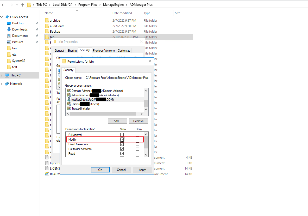 The user is not granted Modify permission for the following folders.