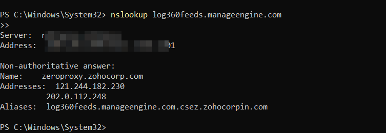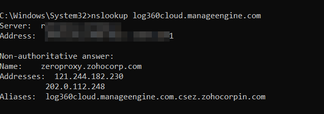 nslookup log360cloud.manageengine.com 8.8.8.8( Where 8.8.8.8 is Google DNS)