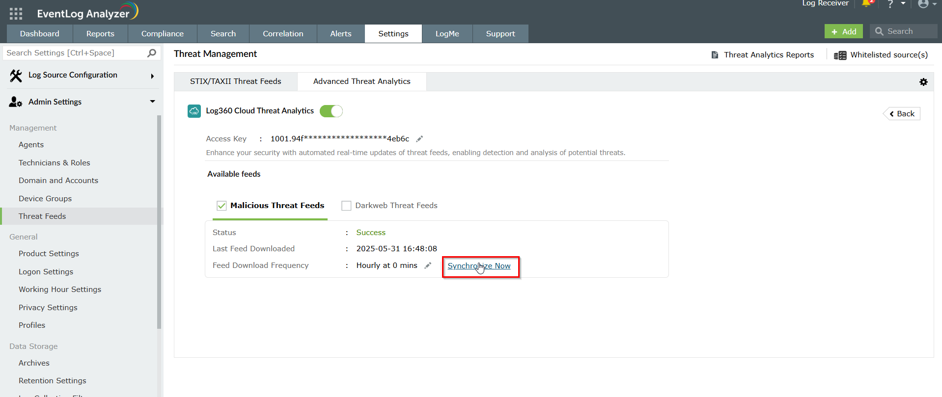 In Advanced Threat Analytics, the Malicious Threat Feed status will show as "Failed" if EventLog Analyzer is unable to communicate with Log360Cloud Threat feed server to retrieve the latest threat feed data.