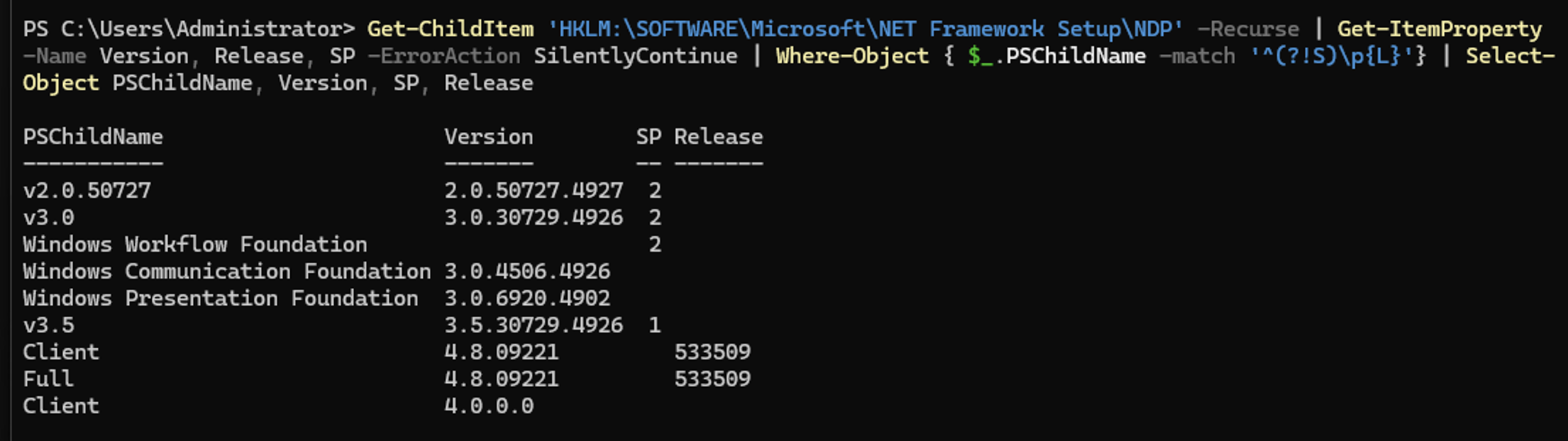 Get-ChildItem 'HKLM:\SOFTWARE\Microsoft\NET Framework Setup\NDP' -Recurse | Get-ItemProperty -Name Version, Release, SP -ErrorAction SilentlyContinue | Where-Object { $_.PSChildName -match '^(?!S)\p{L}'} | Select-Object PSChildName, Version, SP, Release- Confirm that .NET Framework v3.0 listed and has SP ≥ 1