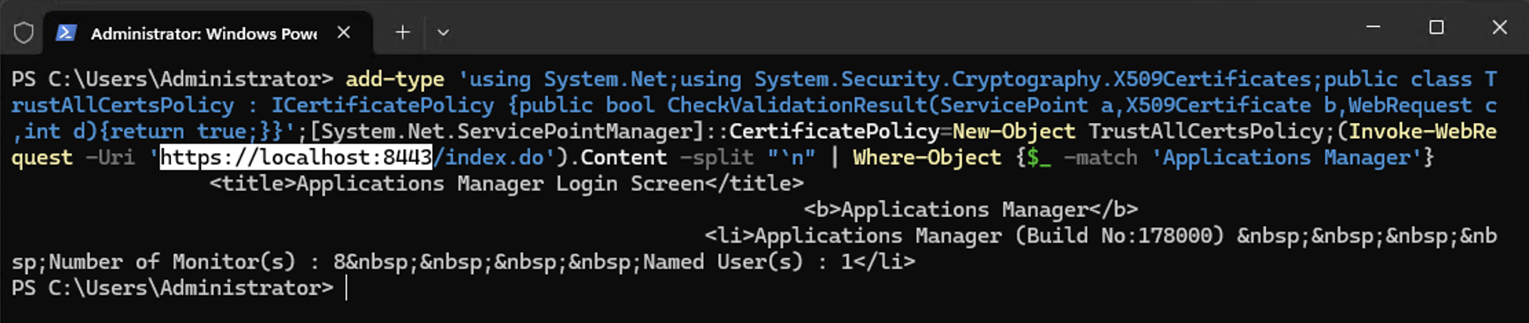 add-type 'using System.Net;using System.Security.Cryptography.X509Certificates;public class TrustAllCertsPolicy : ICertificatePolicy {public bool CheckValidationResult(ServicePoint a,X509Certificate b,WebRequest c,int d){return true;}}';[System.Net.ServicePointManager]::CertificatePolicy=New-Object TrustAllCertsPolicy;(Invoke-WebRequest -Uri '<Apm_EndPoint_Urls>/index.do').Content -split "`n" | Where-Object {$_ -match 'Applications Manager'}