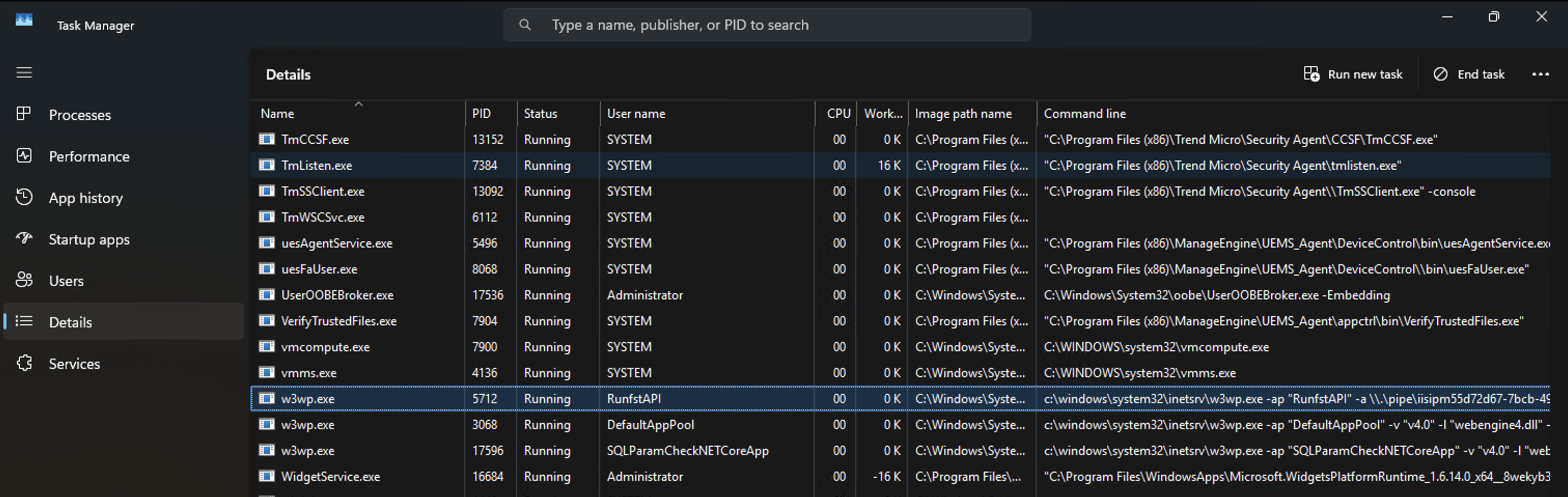 - Locate your target application process: w3wp.exe for IIS app, <service_name>.exe for services, or the main executable for desktop apps.