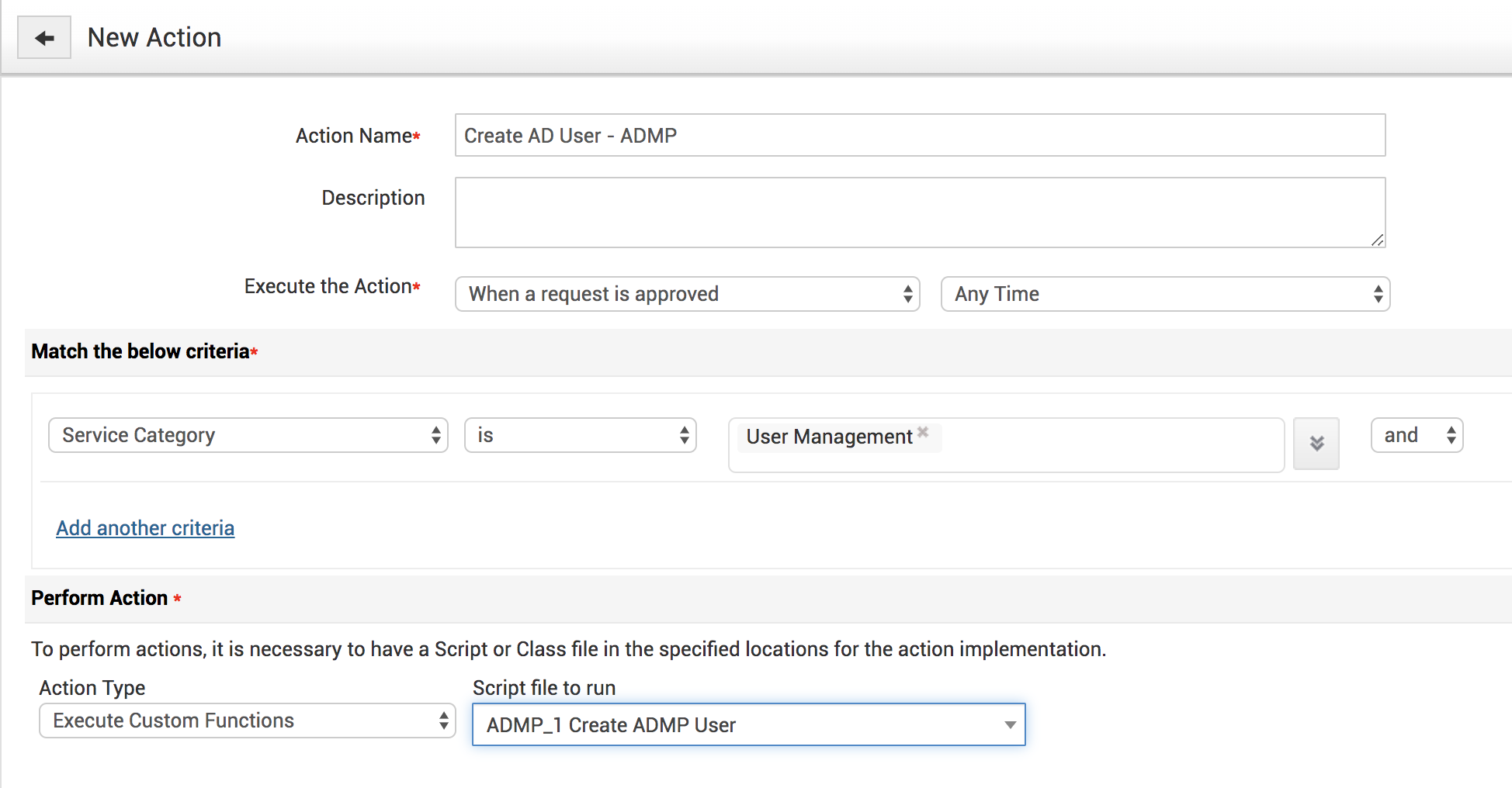 5. With custom triggers we can configure a criteria such as ‘when a request is created or approved’ to invoke the deluge script stored in the custom function and automatically create an user account in ADMP.