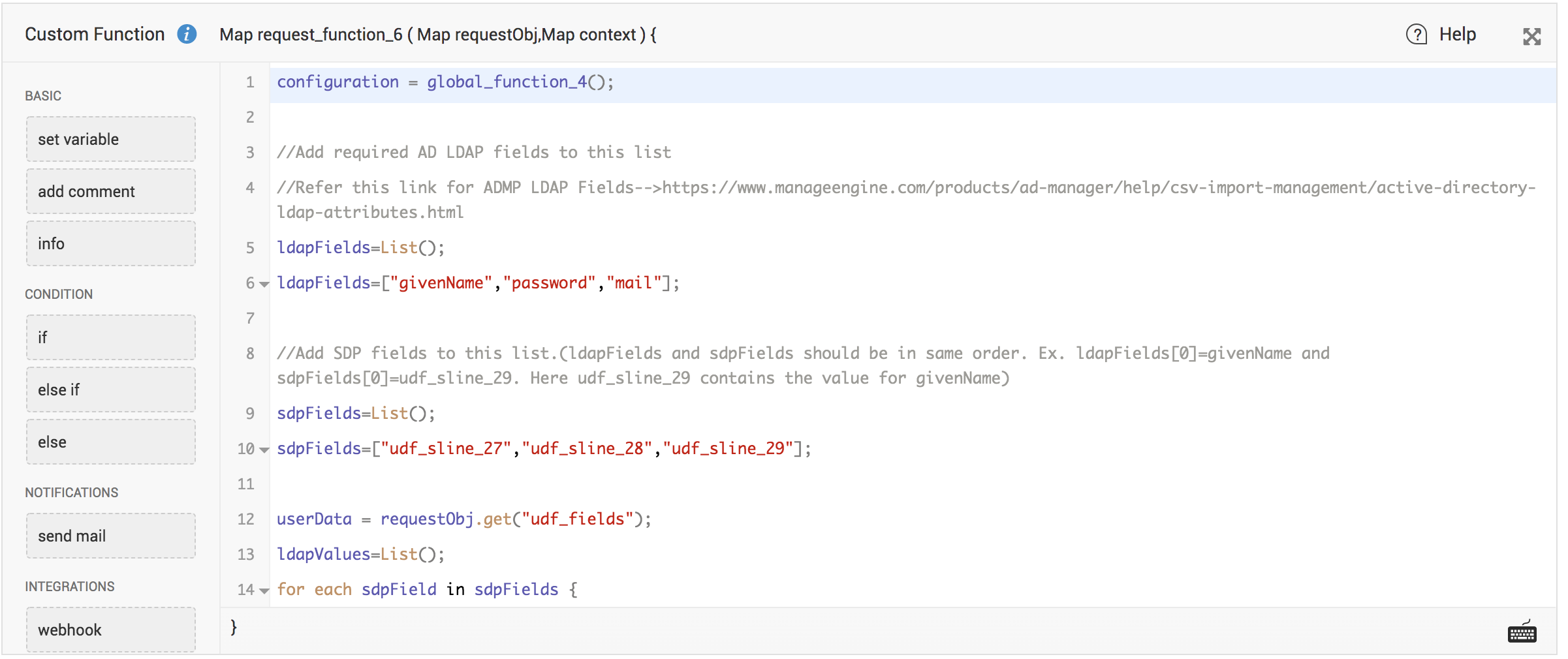 Add API field names (of ServiceDesk Plus additional fields) and LDAP field values (of ADManager Plus fields) to the script after ensuring that they are mapped correctly.
