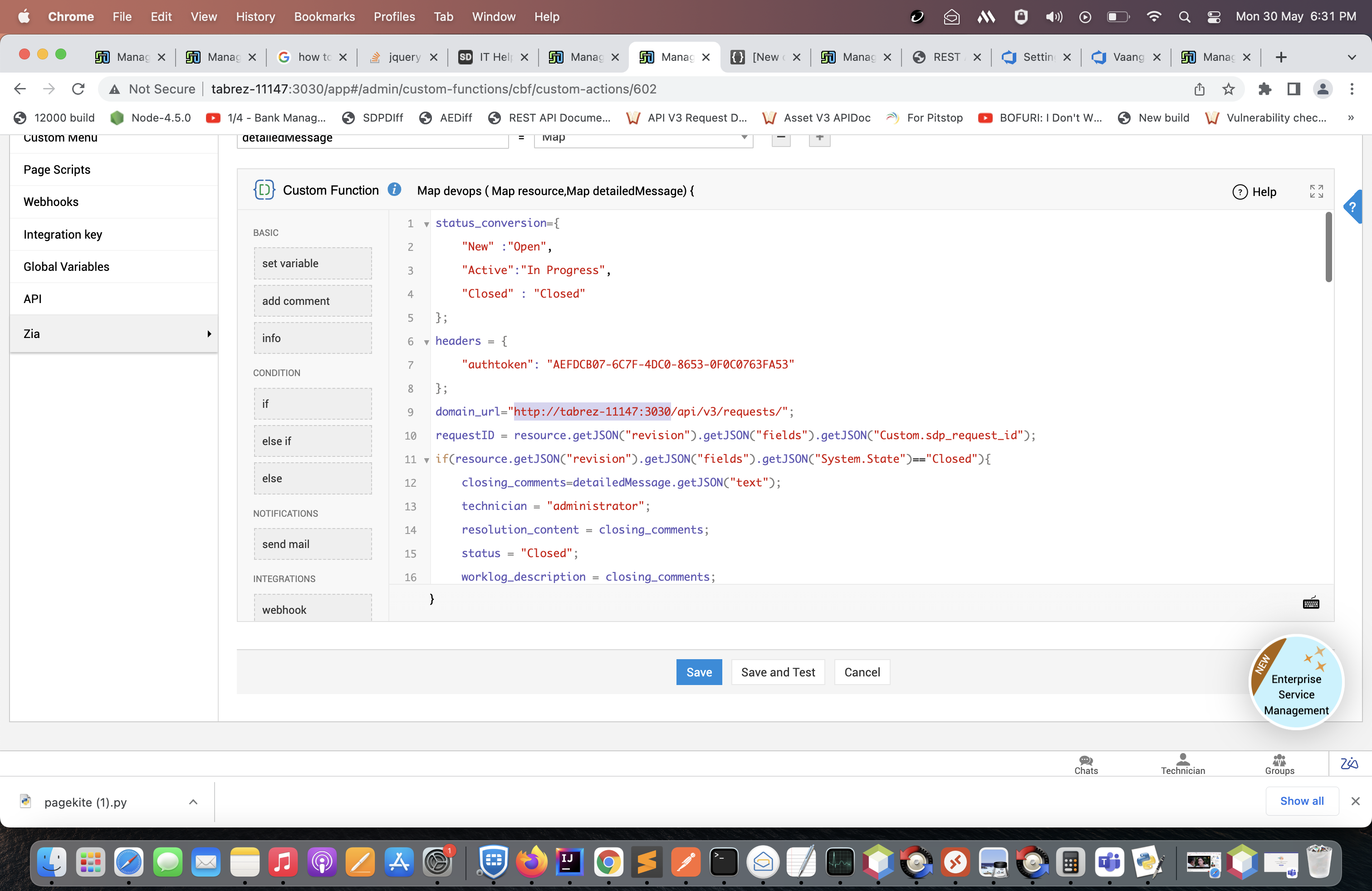 5. Copy the code from the ticket_closure text file and paste it in coding section of Callback function. Replace the domain name (highlighted part in the screenshot) with user's SDP domain name at all the positions in the code and integration key (authtoken) with user's integration key (User can generate this key at admin settings>Integration key).