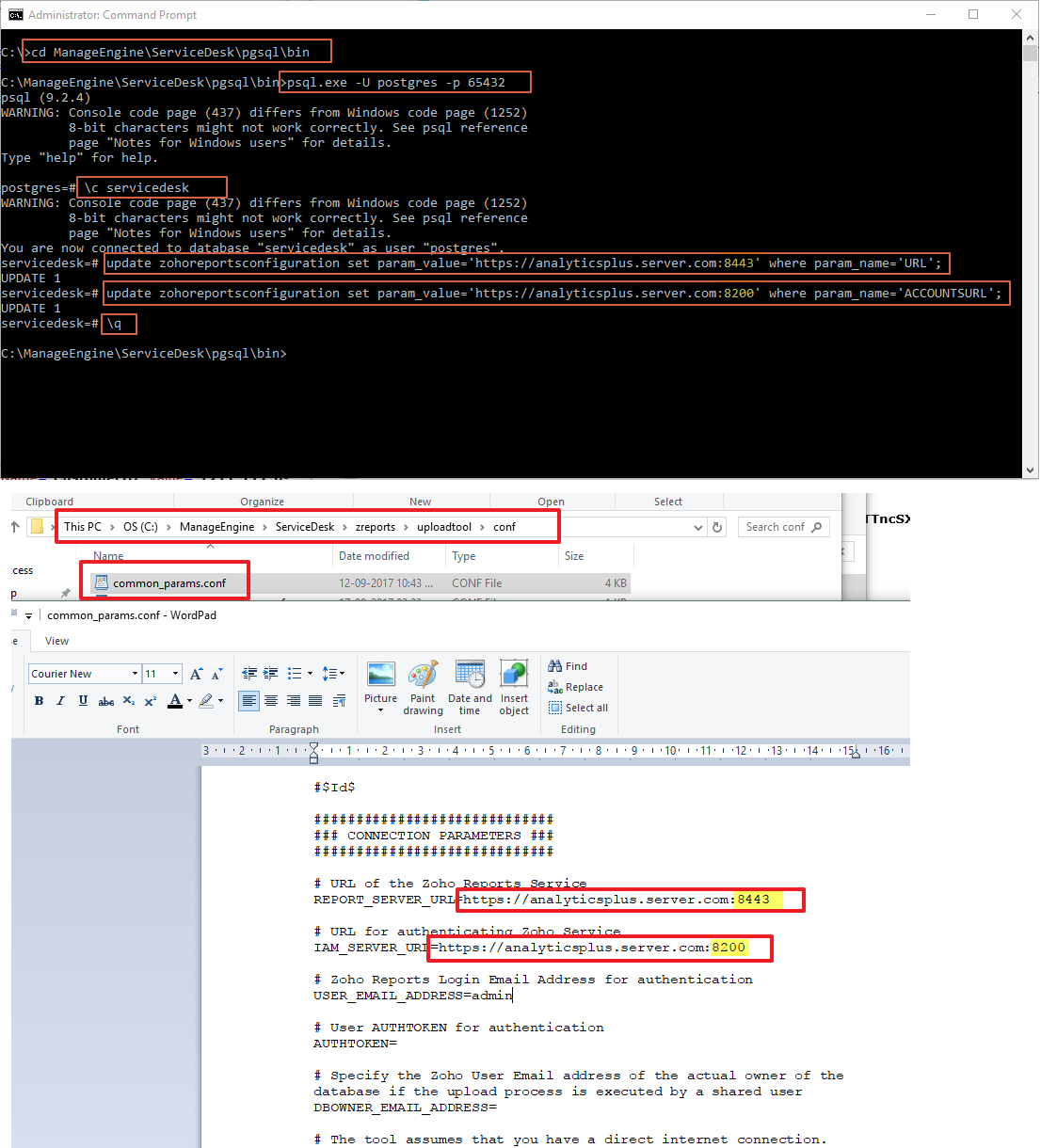 <ServiceDesk Home>\zreports\uploadtool\conf\common_params.conf and update below entries with target FQDN