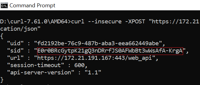 - curl --insecure -XPOST "https://managementServerIP/web_api/login" --data-binary "{\"user\": \"givenUserName\", \"password\": \"givenPassword\"}" -H "Content-Type: application/json"