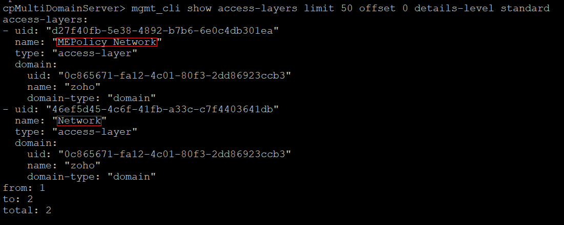 - mgmt_cli show access-layers limit 50 offset 0 details-level "standard" --format json