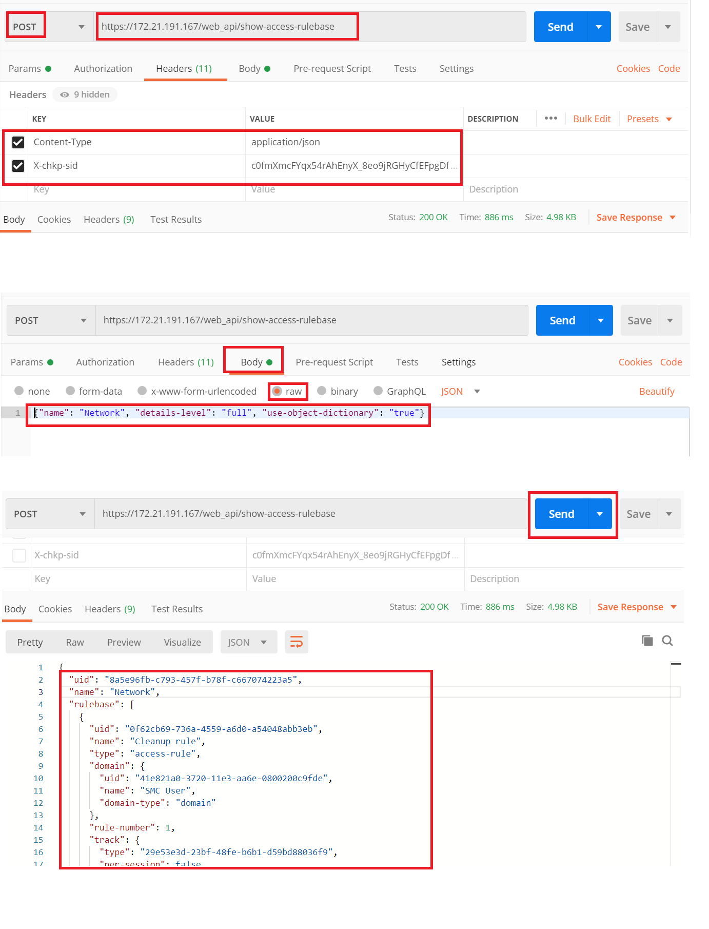 - URL = https://managementServerIP/web_api/show-access-rulebase (Need to update managementServerIP value)
