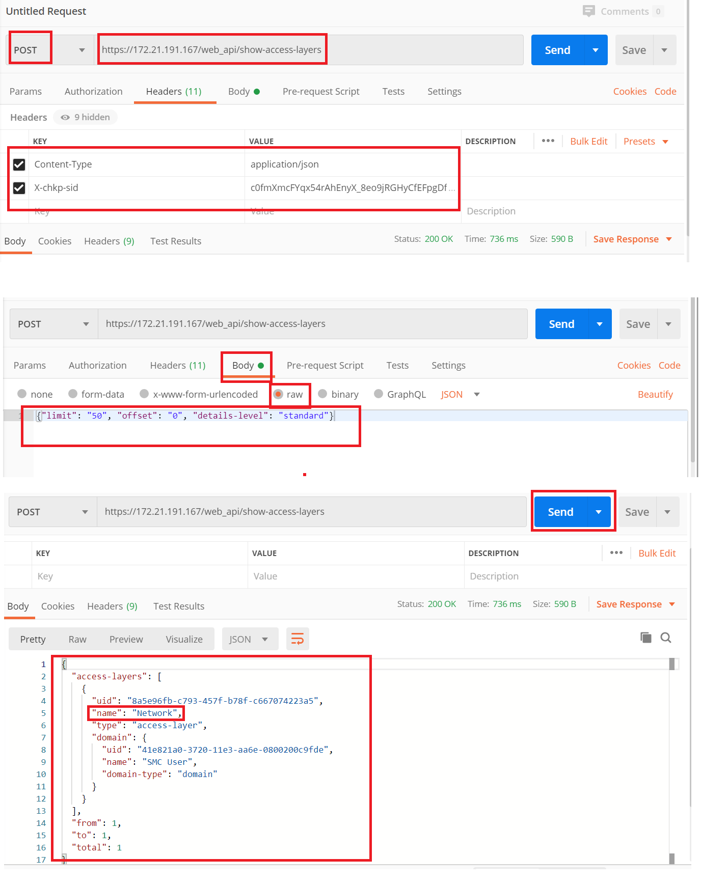 - URL = https://managementServerIP/web_api/show-access-layers (Need to update managementServerIP value)