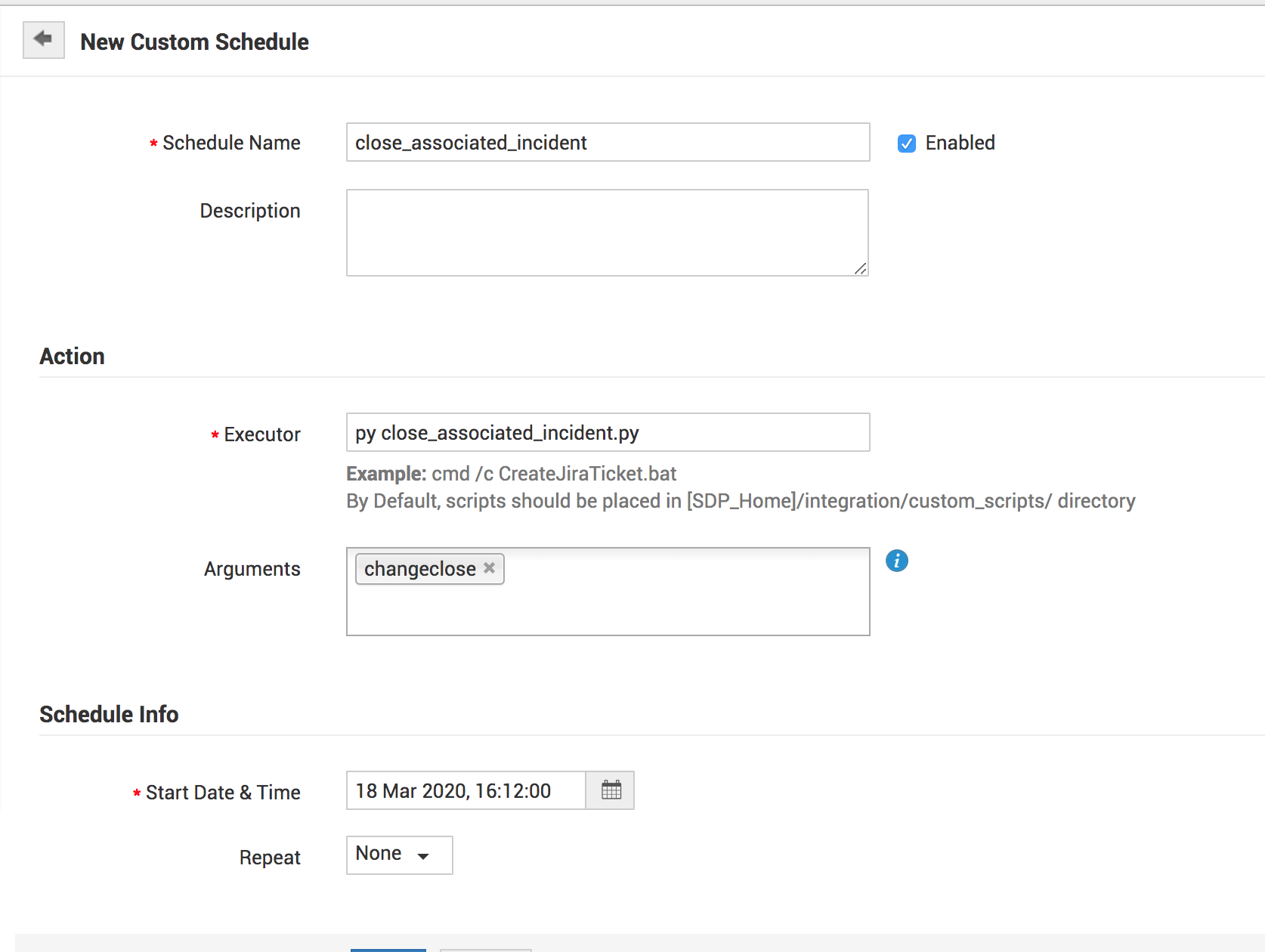 2. Downloaded the attached Zip file and move the files to ManageEngine/ ServiceDesk/ integration/custom_scripts folder 3. Edit configuration.json file and update the application URL and the Technician Key 4. Configure the schedule under Admin--> Custom Schedule