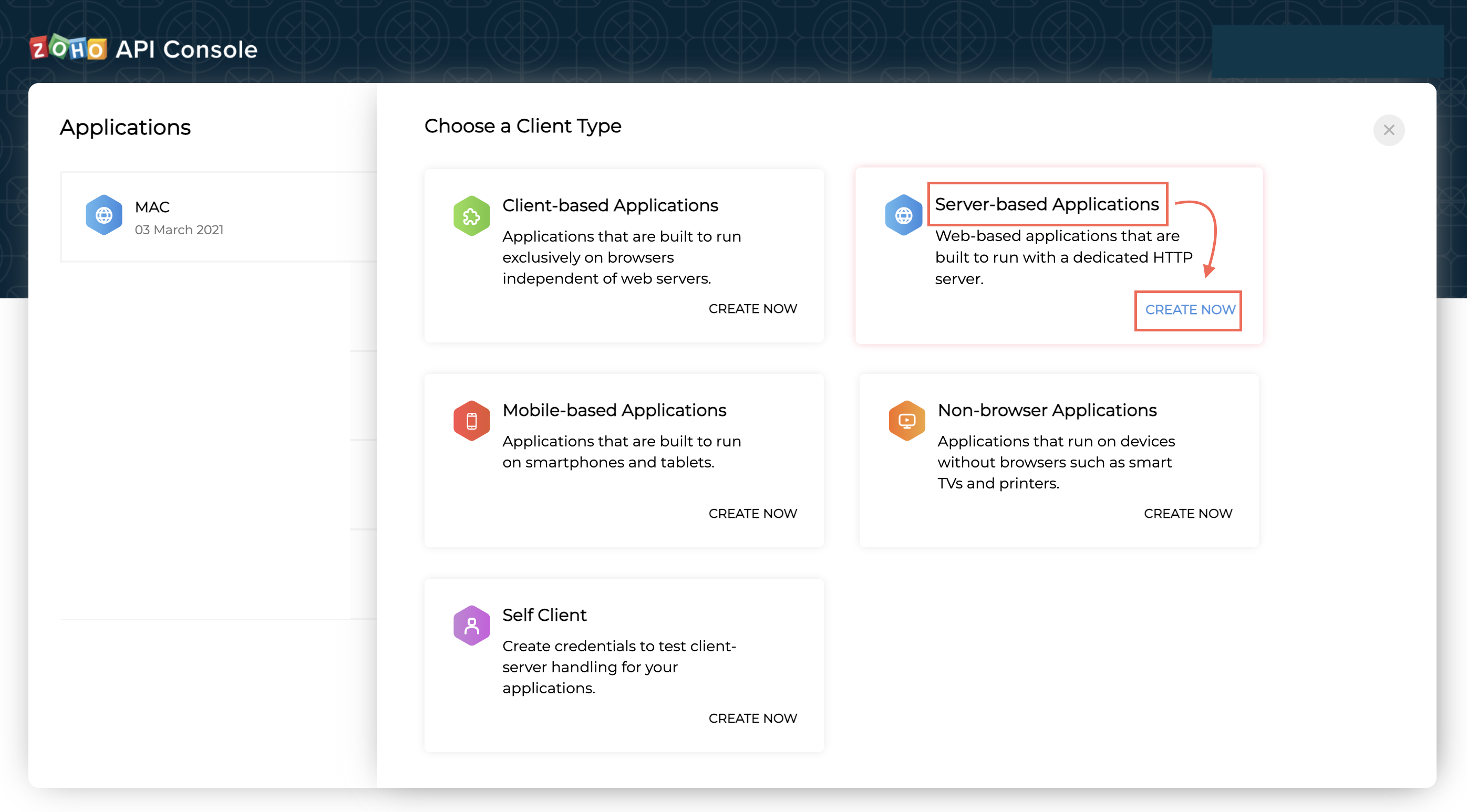 Click on Add Client and choose client type as Server Based Application and click on Create Now