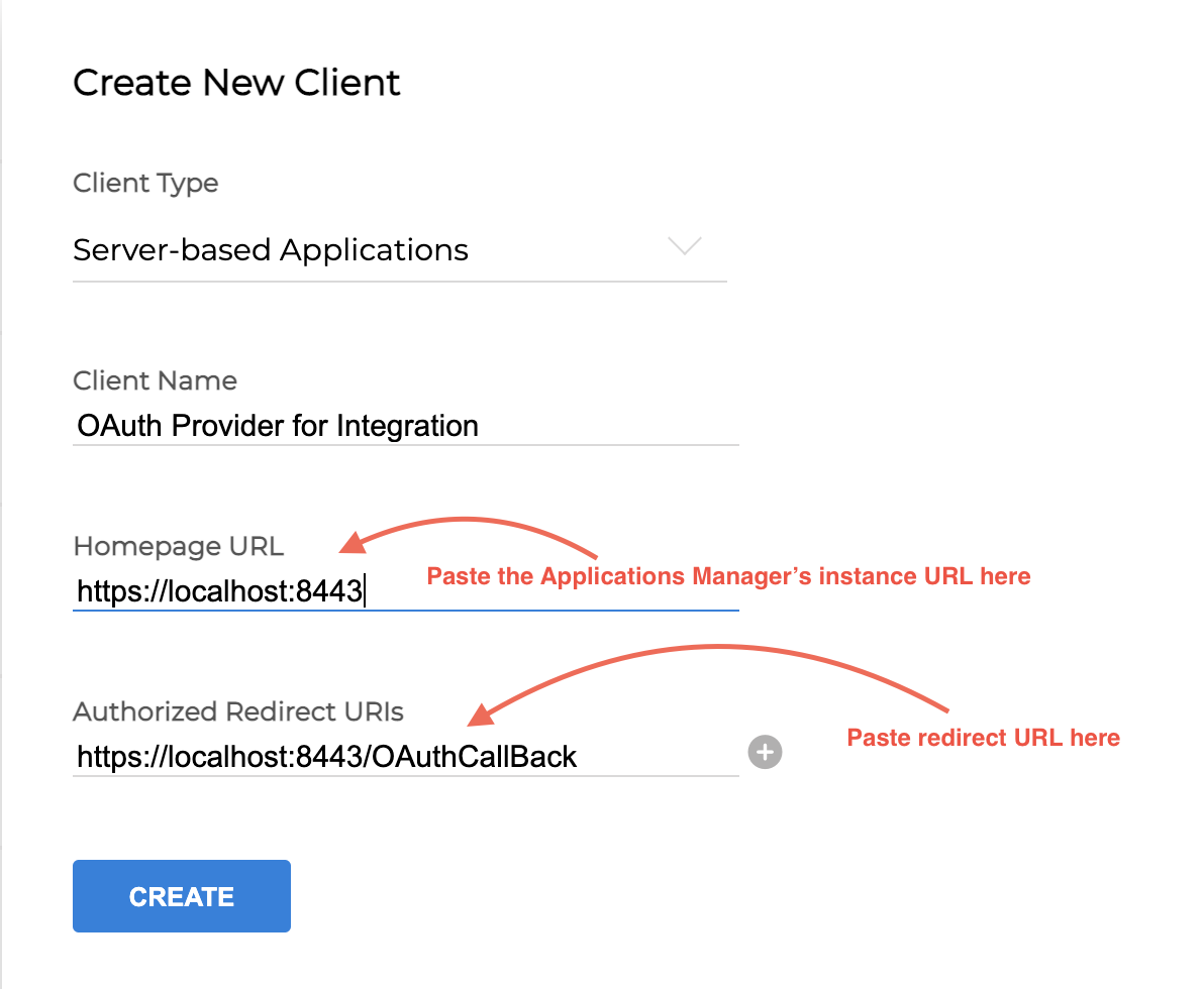 6. In the webpage that opens, paste the Redirect URI copied earlier and for the Homepage URL again paste the Redirect URI and remove the /OauthCallBack from it. Give any name of your choice and click on Create.
