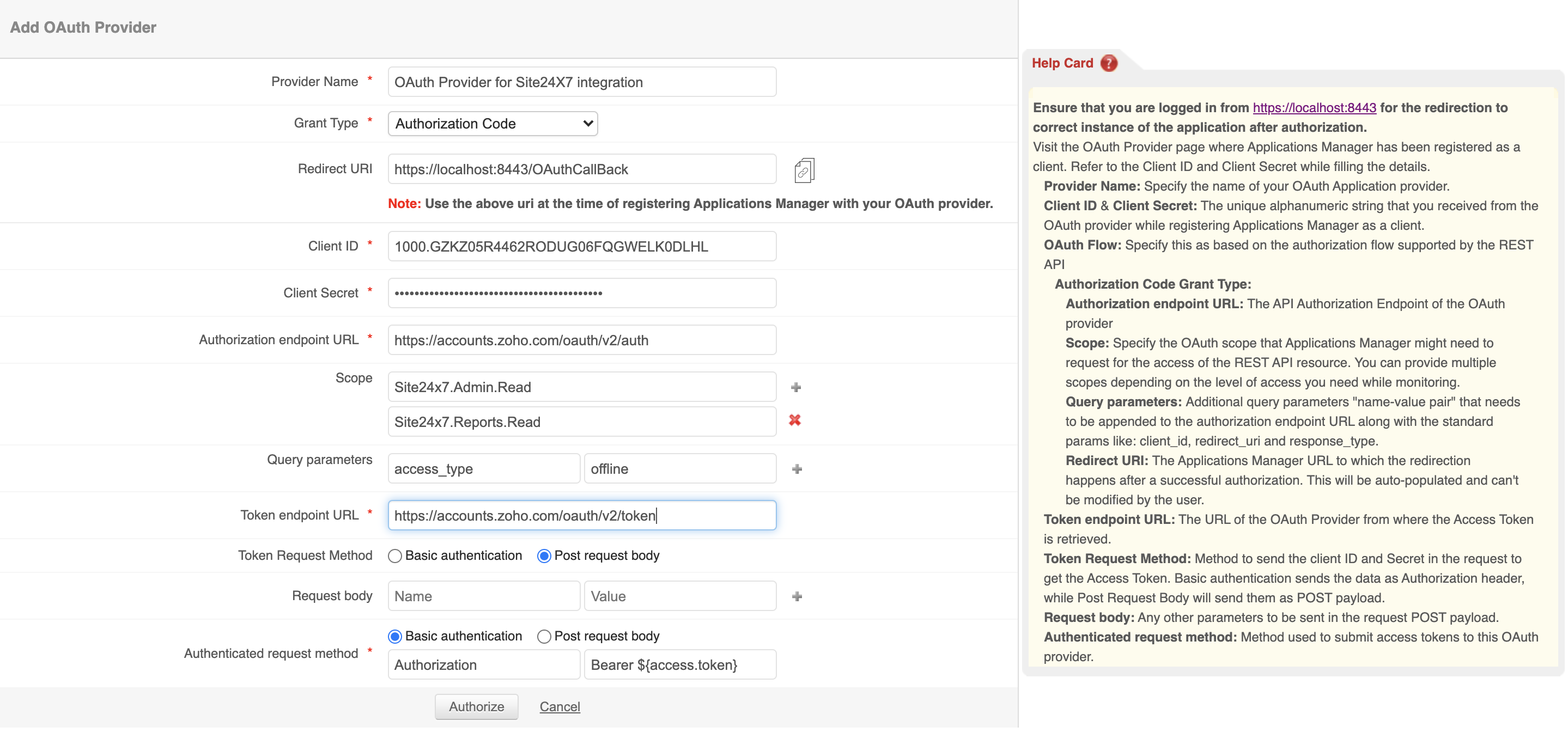 Zoho's OAuth token is used to access services in Applications Manager like integration with Site24X7, integration with Service desk, access to Zoho Mail APIs etc. As it seems a daunting task to go through all the documentation of the product, here is a step by step process of adding Zoho as OAuth provider for these services