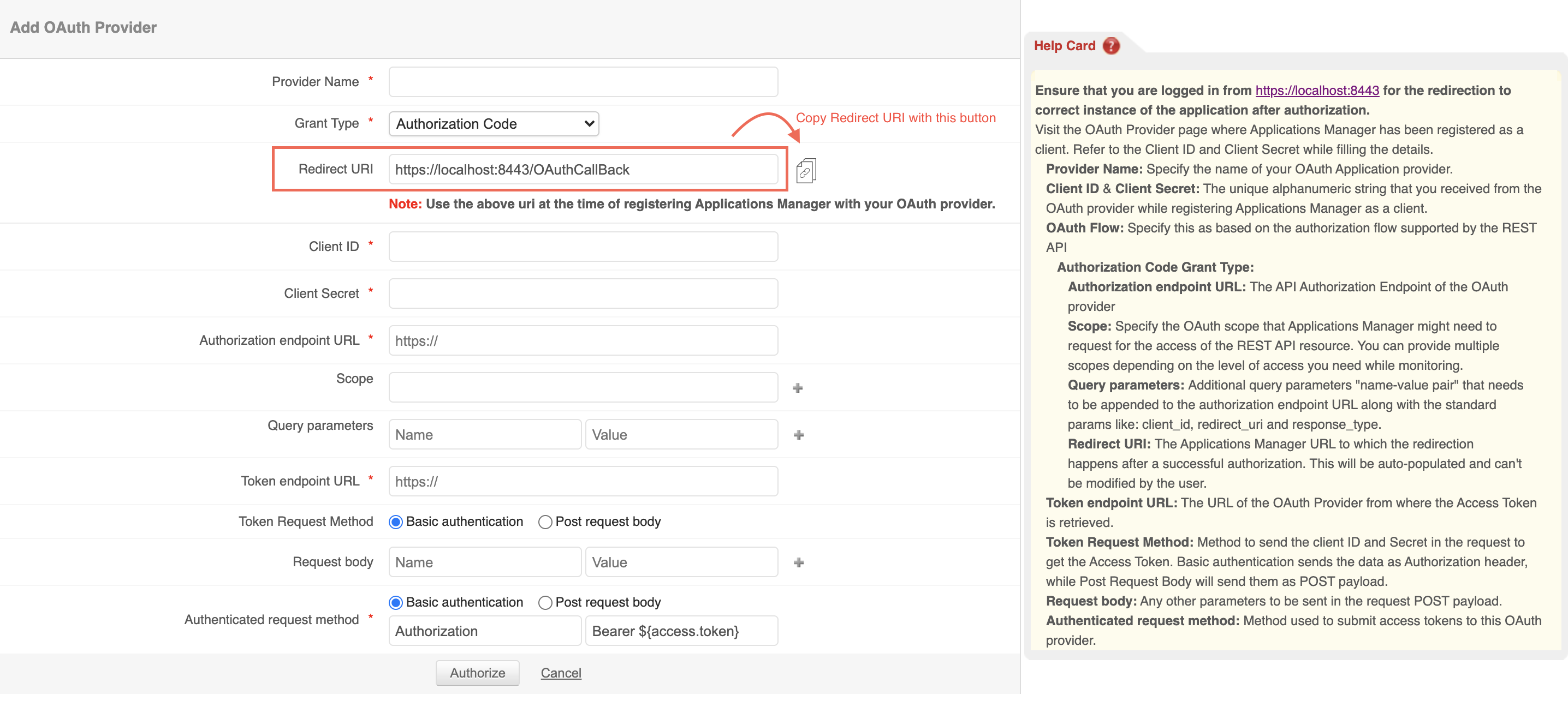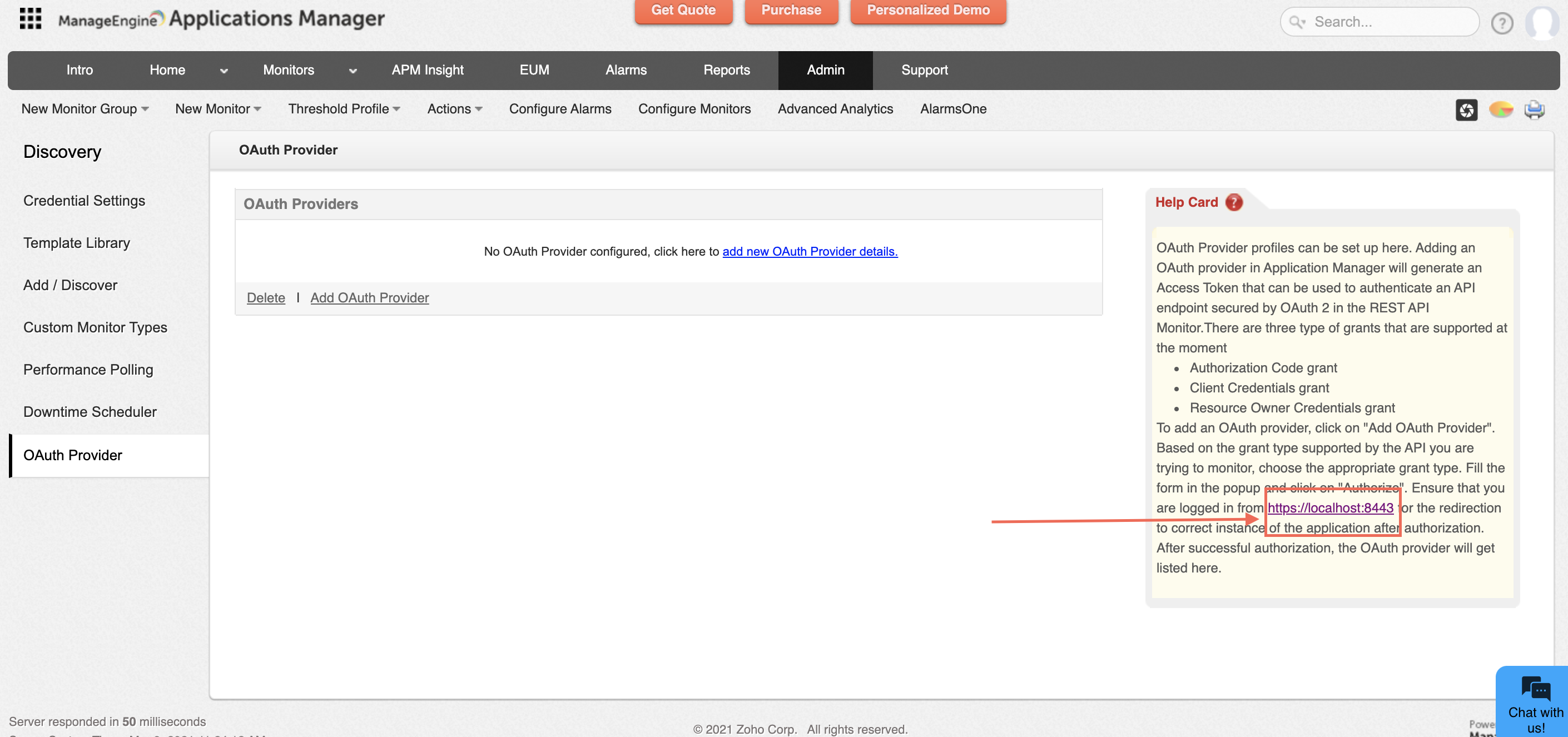 2. In the helpcard on the right side, you will see the link you're expected to be logged in from to configure an OAuth provider. Click on that link and log in to the Applications Manager instance