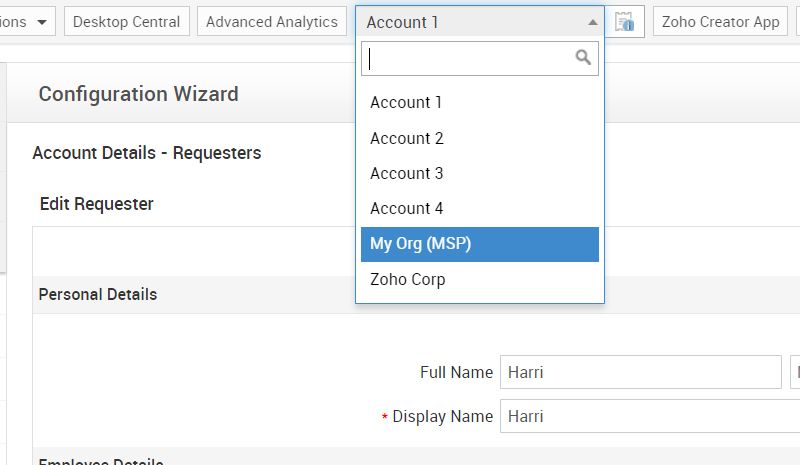 4) Select the MSP account at the top and then click Save. Once done, you will see this user under MSP requester and from there you can convert him as a technician.