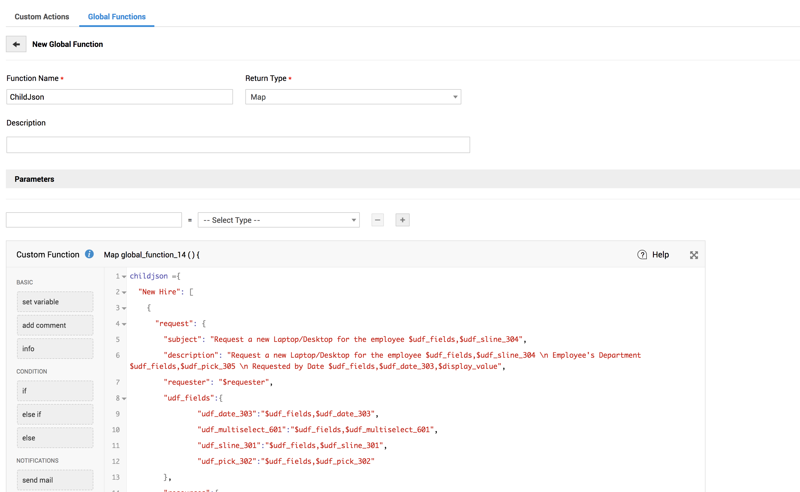 2. Goto Admin > Request Custom Function > Global Function > New > Paste the contents of childJson.txt and save it with a name. Update the parent template name and the udf fields.