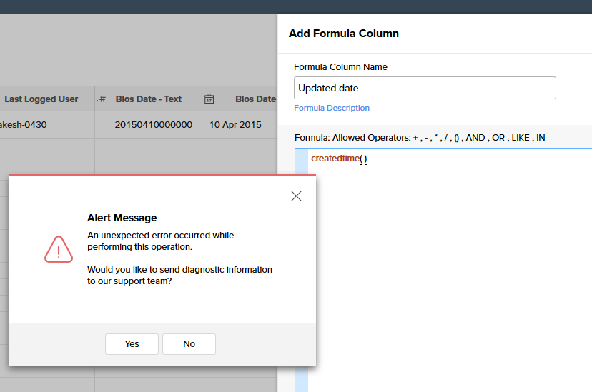 Issue: When we create a formula column using the 'createdtime()' function, it throws unexpected error occurred.