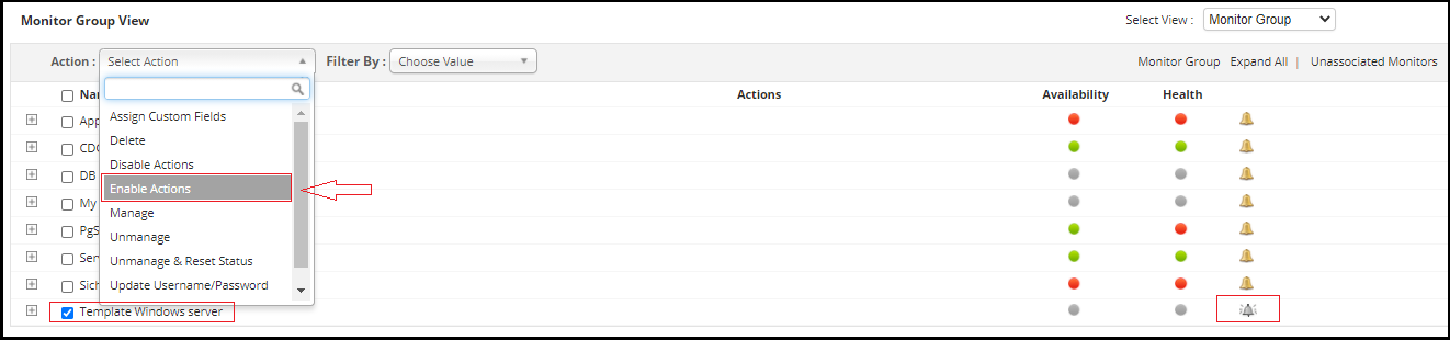 4.) If the above field is checked and the monitor is present in any of the groups, verify whether actions are enabled in the group level. This can be verified from the Monitor group view as show in the screenshot below .