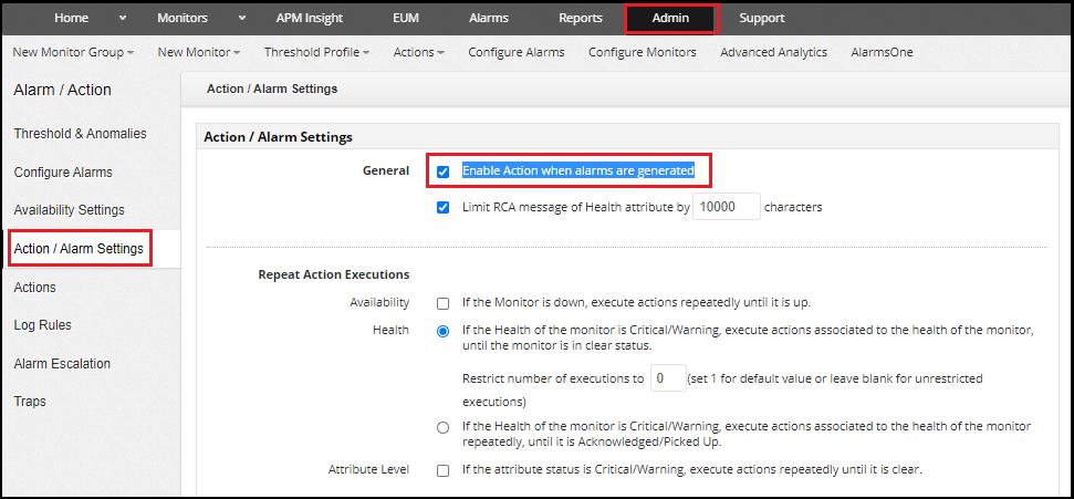 3.) If SMTP works, navigate to Admin-> Action\Alarm settings tab and check if “ Enable Action when alarms are generated ” field is checked.