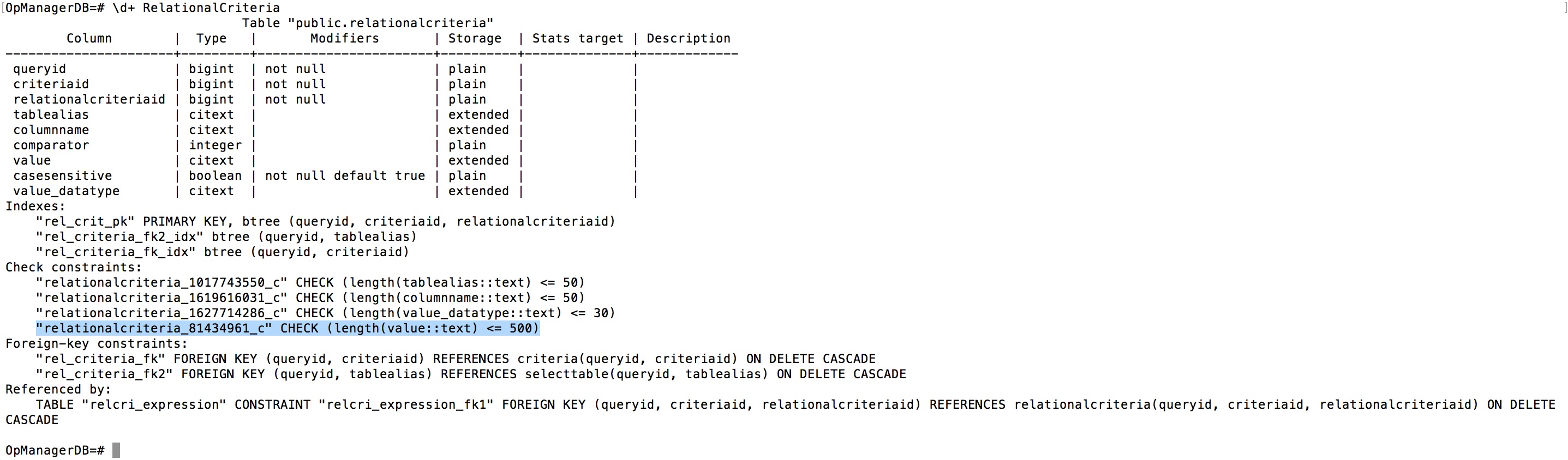 3. Execute the query \d+ RelationalCriteria and note the highlighted criteria and remove the constraint for the column value.