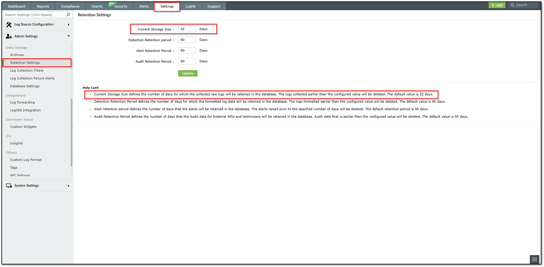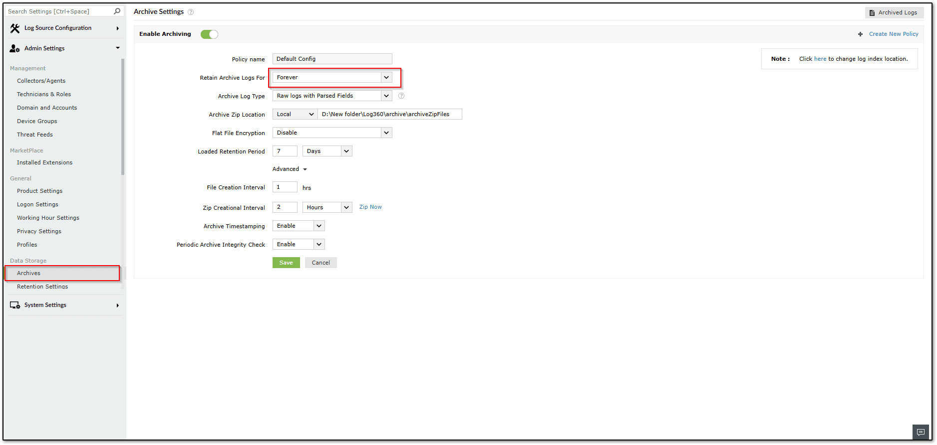 The retention for EventLog Analyzer archives is set as "Forever" by default which can be adjusted as per requirement in Archive Settings. Reducing the archive retention settings can reduce the storage consumption. Please follow the below steps to reduce archive settings.