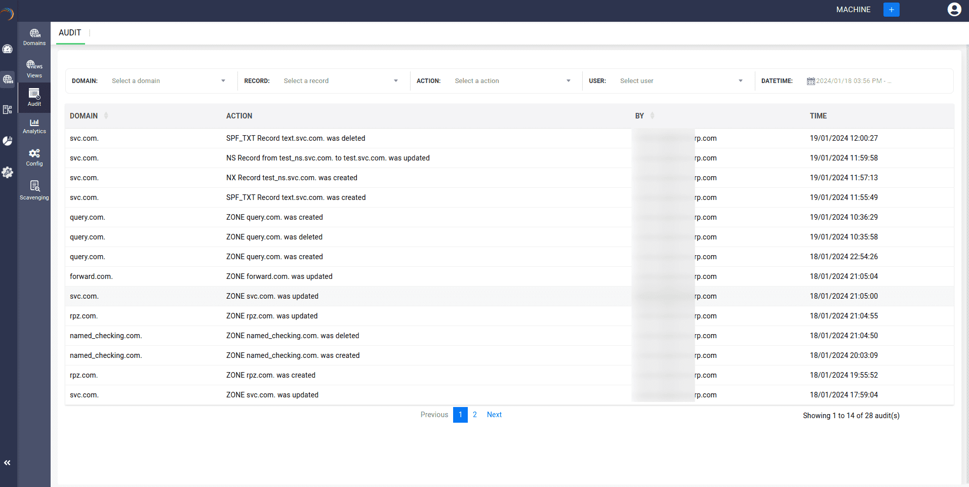 ManageEngine enables you to view the audit logs of specific domains Select the DNS menu from the menu bar along the left side of the screen.From the submenus that appear, choose Audit. The Audit page helps you to continuously evaluate the overall ...
