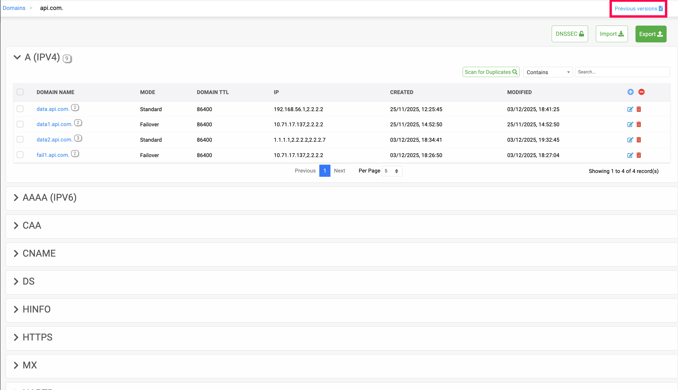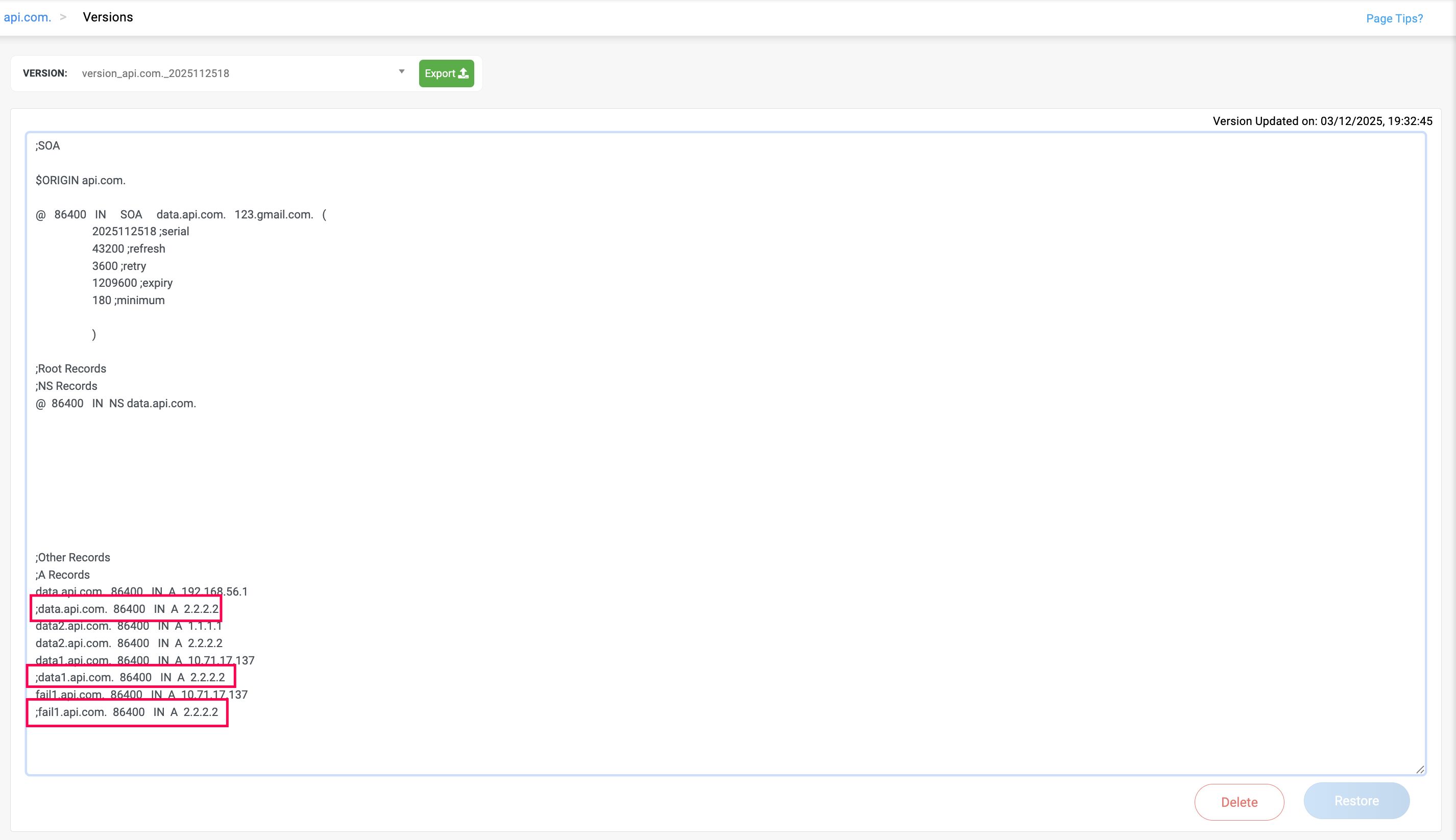 Zone versioning in DDI Central allows to view the previous versions of the zone, which can also be exported or restored as the current version.