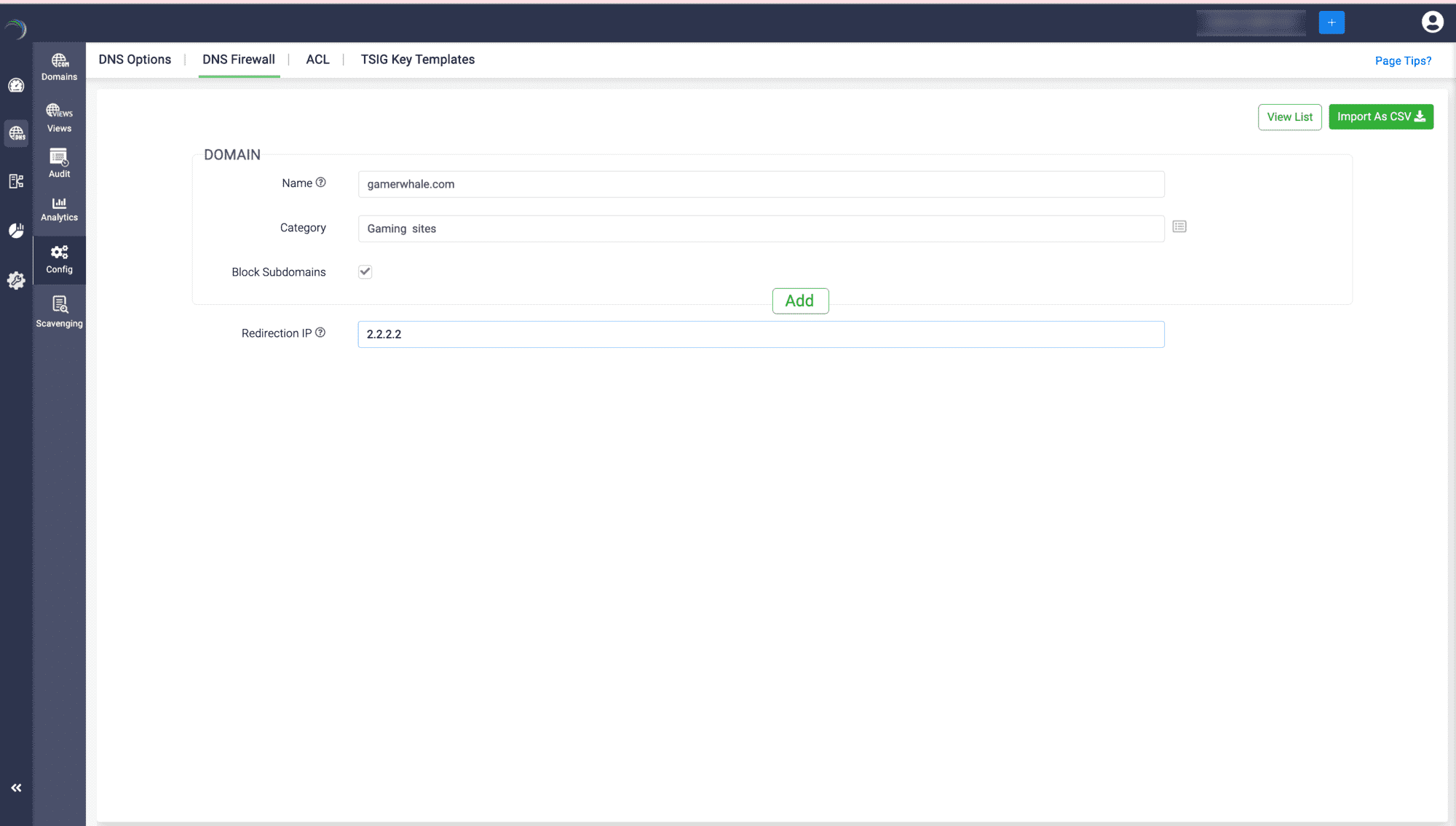 - Once you click Add, you will see two separate lists, one that says Domains Blocked and the other says Domains blocked along with subdomains. This way, you can build your categories of malicious domains on your own.