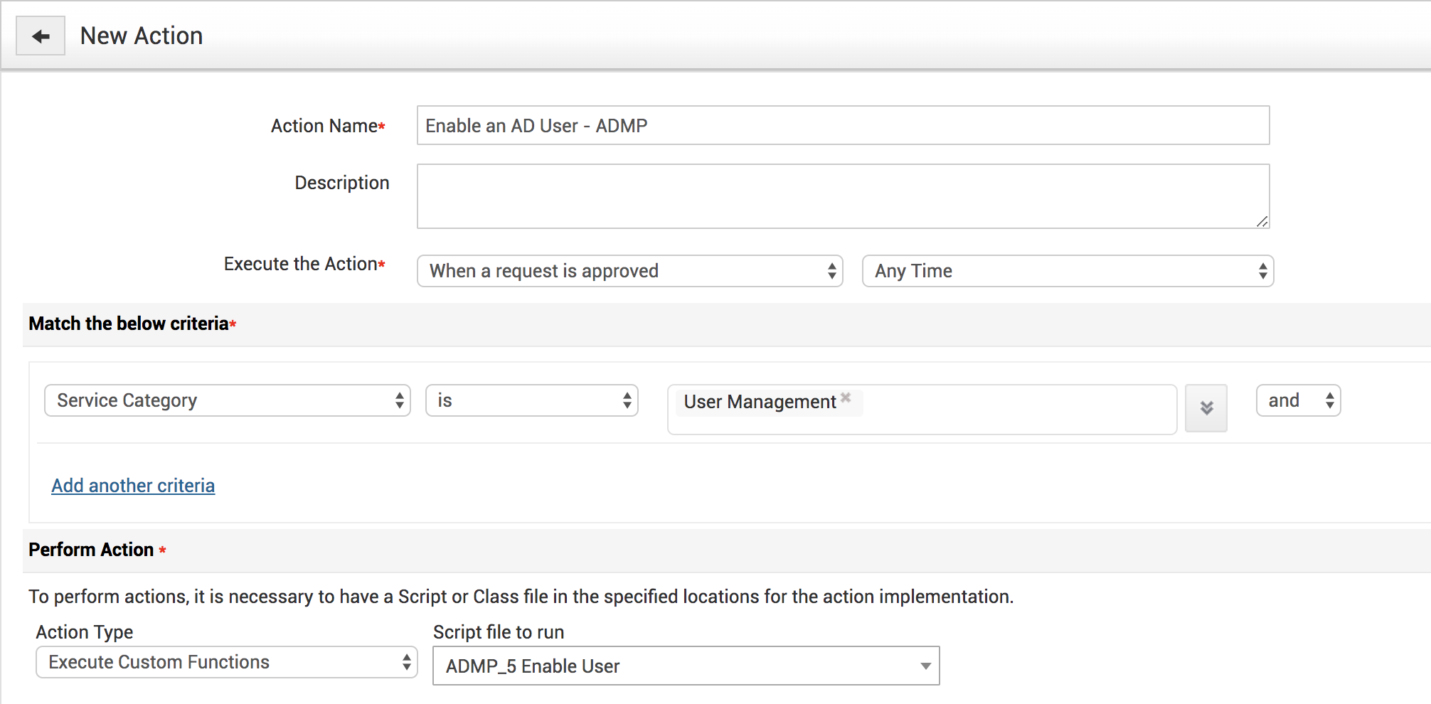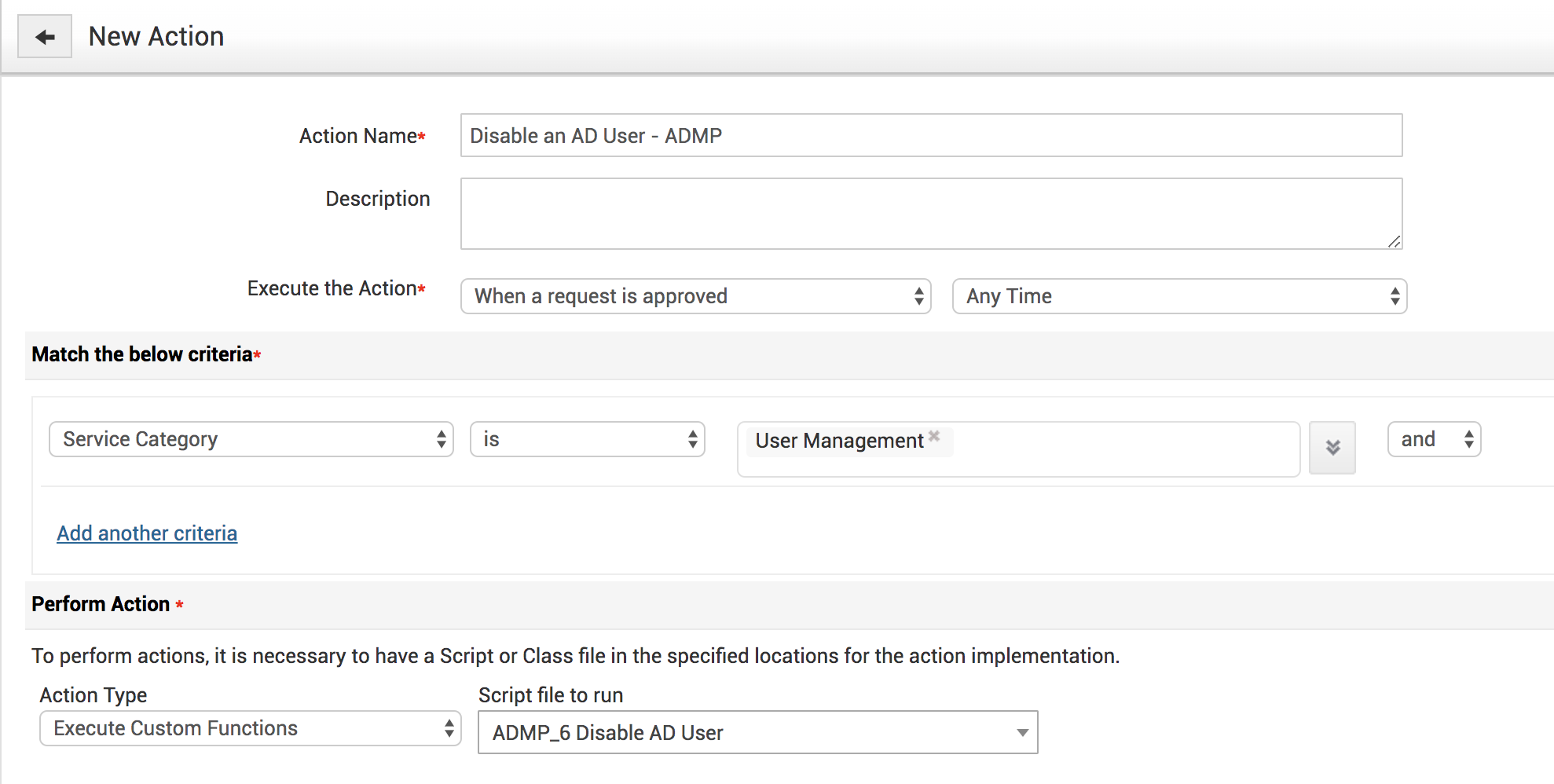 5. With custom triggers we can configure a criteria such as ‘when a request is created or approved’ to invoke the deluge script stored in the custom function and automatically enables/disables the user account in ADMP.
