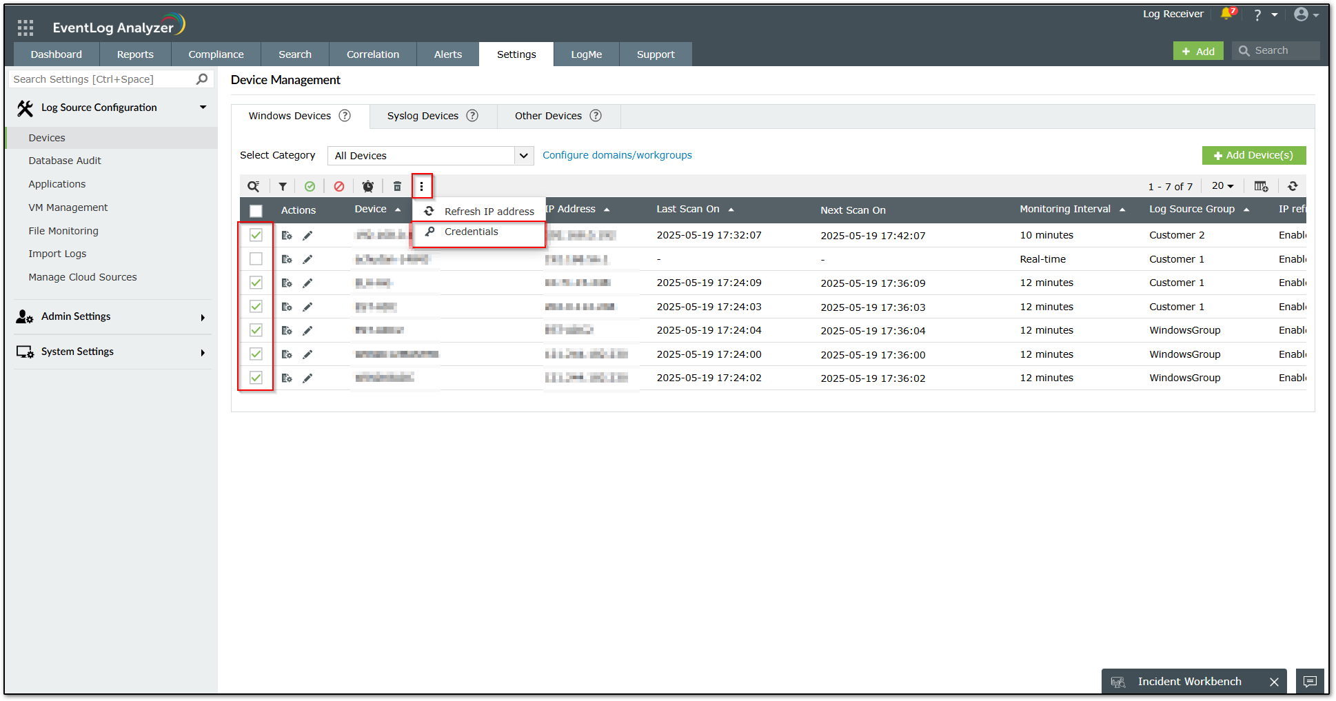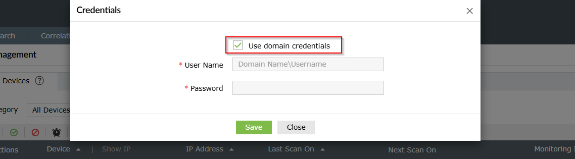 iii. You can perform bulk update or update credential on multiple devices. You can use the filter option to filter the devices based on Device status, Device State, Device Group, and Device Type. The best option here would be Filter based on Device State and set the State as "Inactive" to identify the devices which do not collect events. Enable check box for those devices >> Select more option >> Credentials. You can enter the domain credential manually or enable the check box to choose "Use domain credentials" which uses the credentials used in Domains & Accounts. Save the selection to take effect.