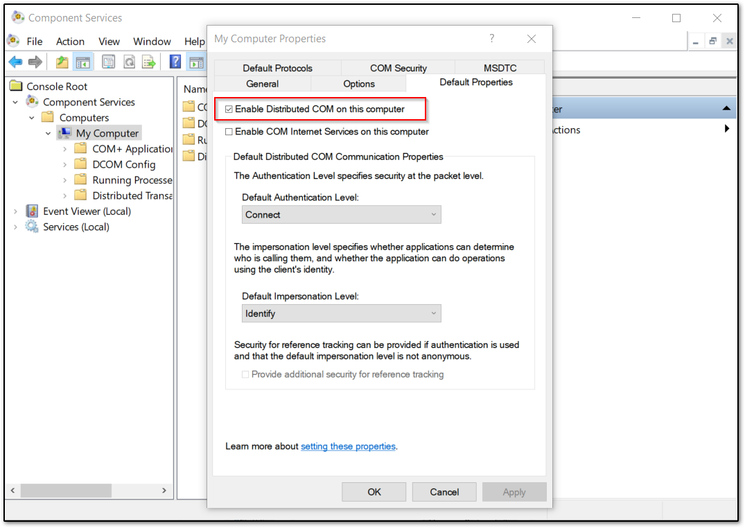 - In the My Computer Properties dialog box, select Default Properties and ensure if "Enable Distributed COM on this computer is enabled"
