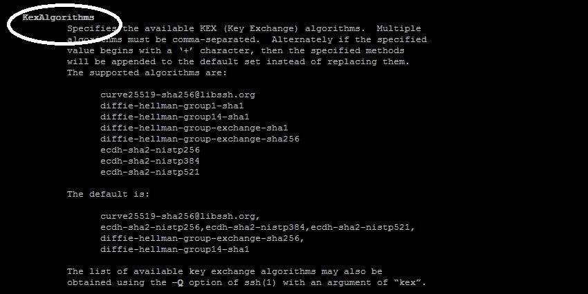 KexAlgorithms ecdh-sha2-nistp256,ecdh-sha2-nistp384,ecdh-sha2-nistp521,diffie-hellman-group-exchange-sha256,diffie-hellman-group14-sha1,diffie-hellman-group-exchange-sha1,diffie-hellman-group1-sha1