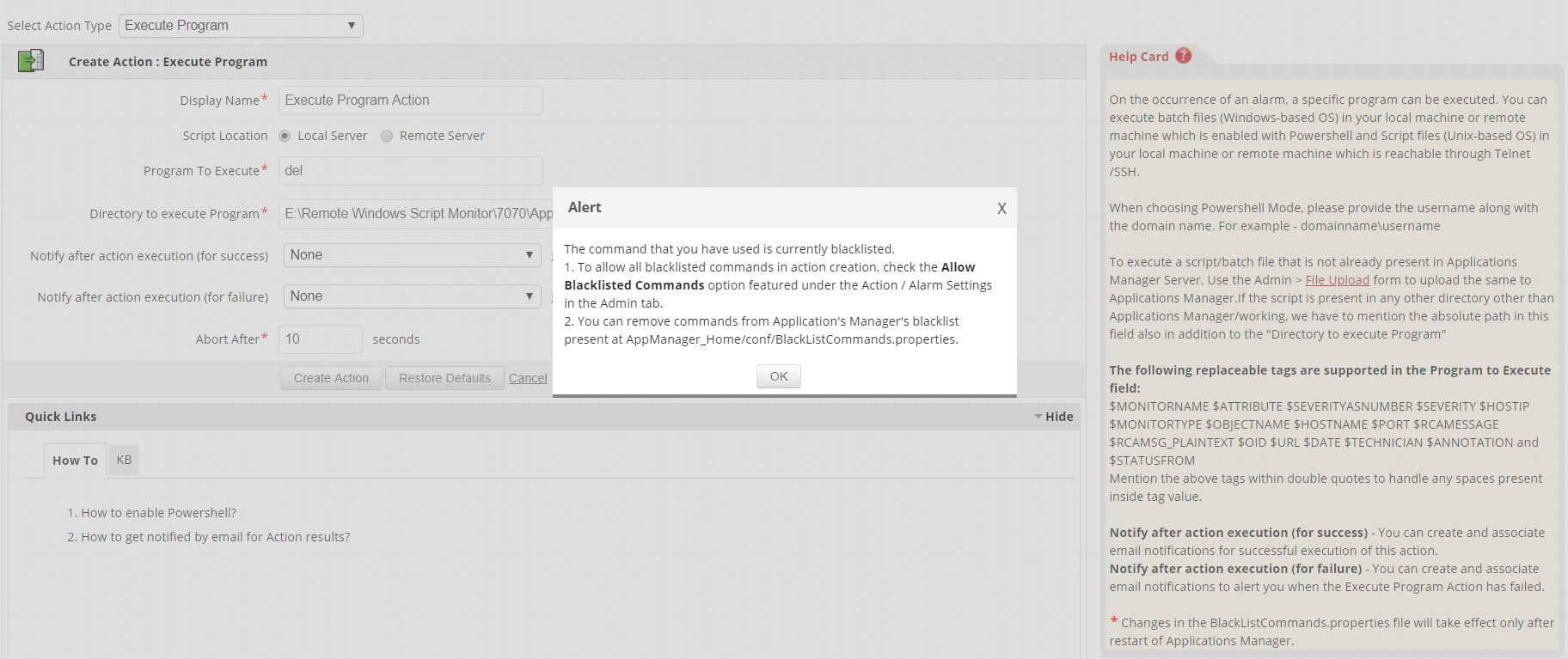 If the user needs to allow the commands in a single shot without removing them from BlackListCommands.properties file, enable the "Allow Blacklisted Commands" checkbox featured in Action / Alarm Settings under Admin tab.