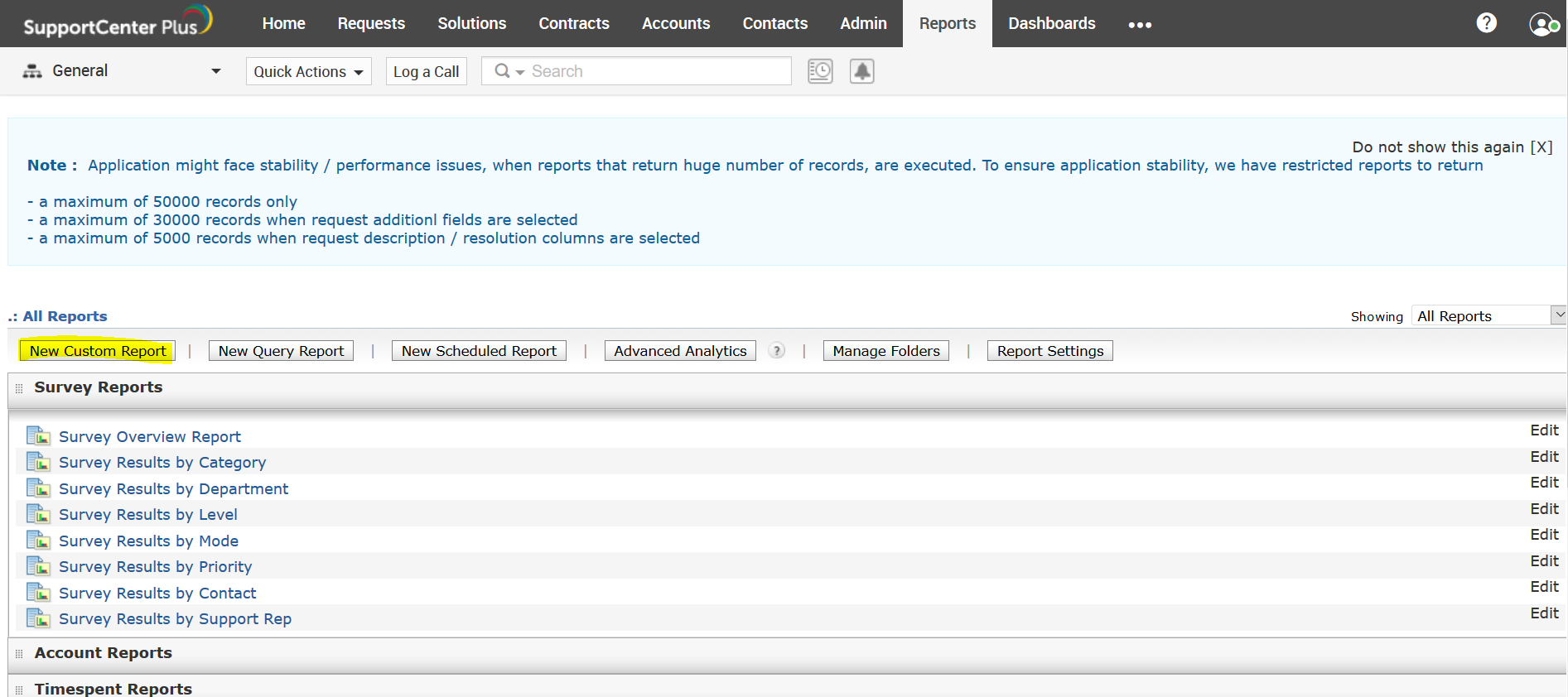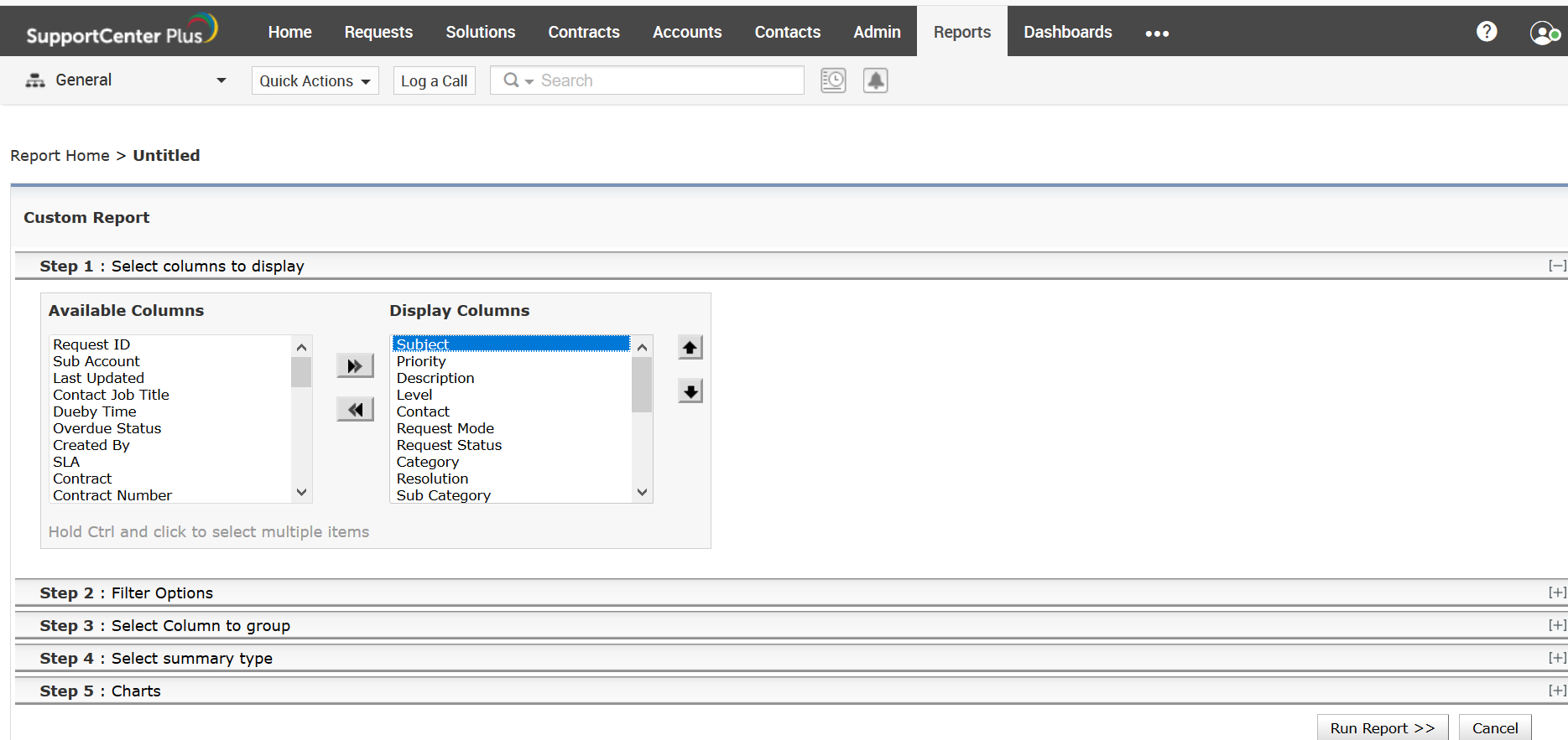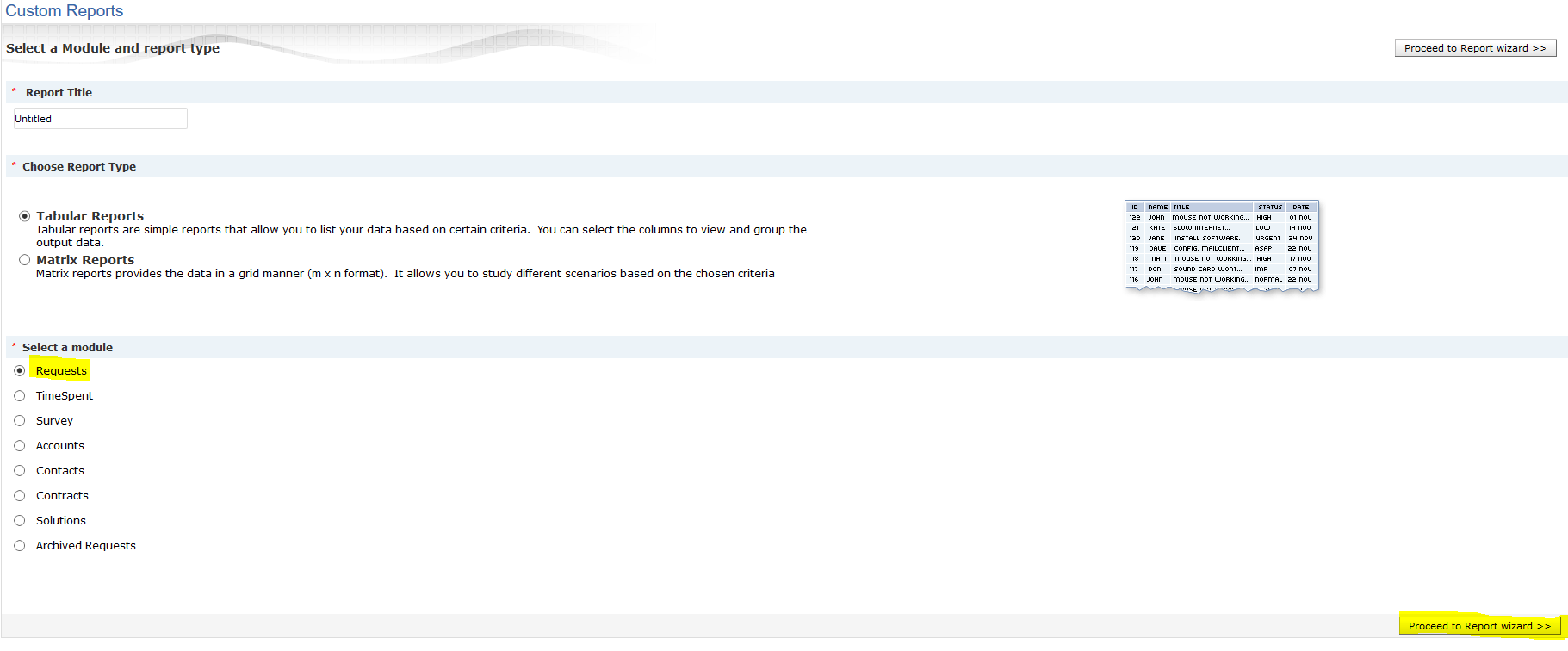 * Go to Reports module and choose New Custom report, select Requests module and proceed to the report wizard.