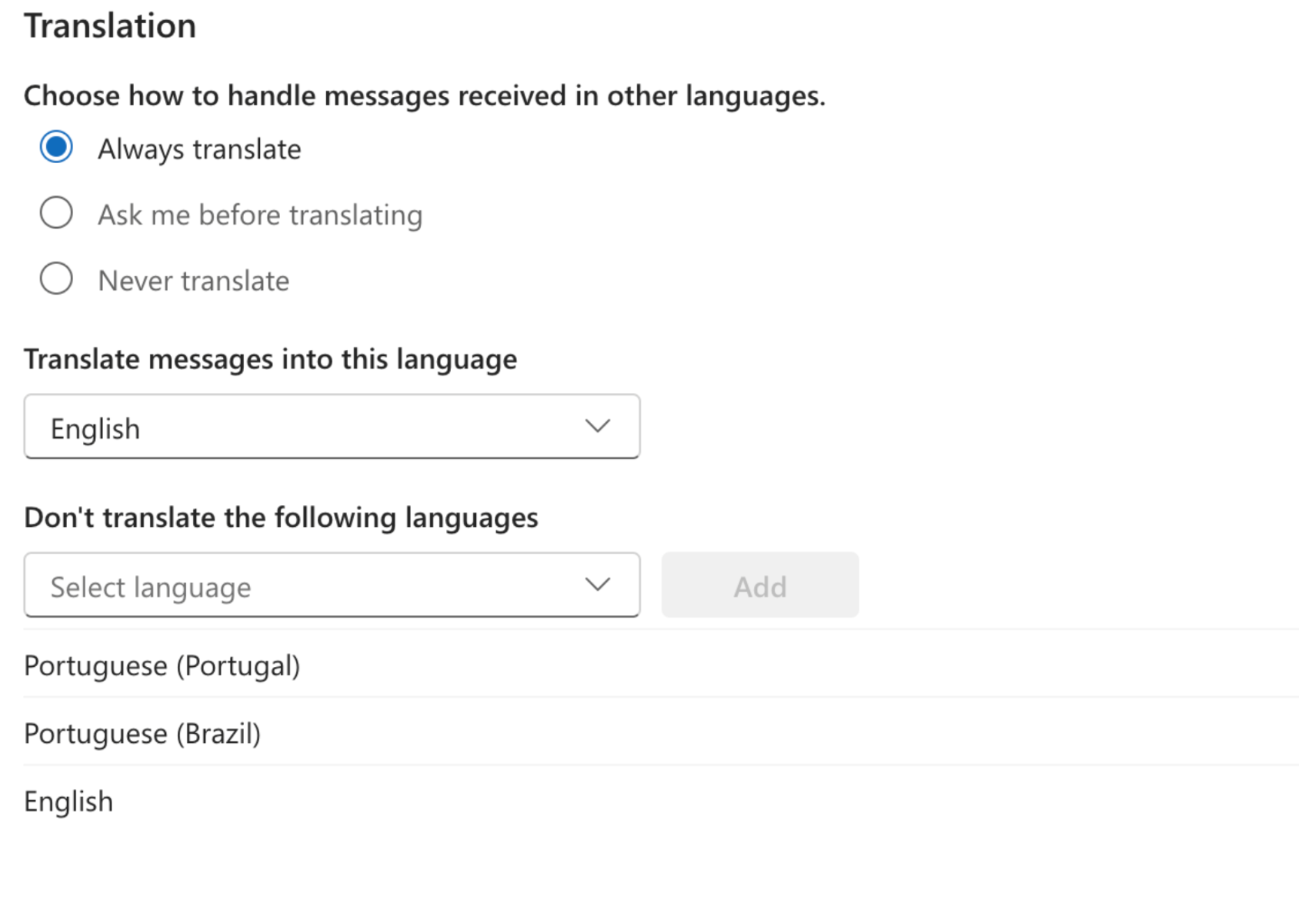 In regard to the language translation within the notification, always ensure that you have chosen the option to "Always translate" in your Outlook mailbox so that the email notification that is being sent to the user is received in the desired language as per the notification template configured in the application. To check this, kindly navigate to your Outlook > Settings > Translation > Always translate